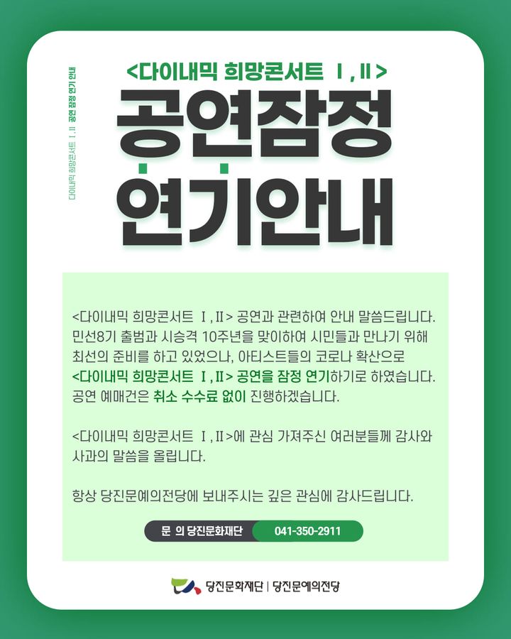 | 60 | 당진시순회연주회<다이내믹 희망콘서트Ⅰ-카르미나부라나>공연취소안내 | 충남교향악단 | 199 | 2022-07-21 | 294892979_7749536438421530_3924672843648858417_n.jpg |