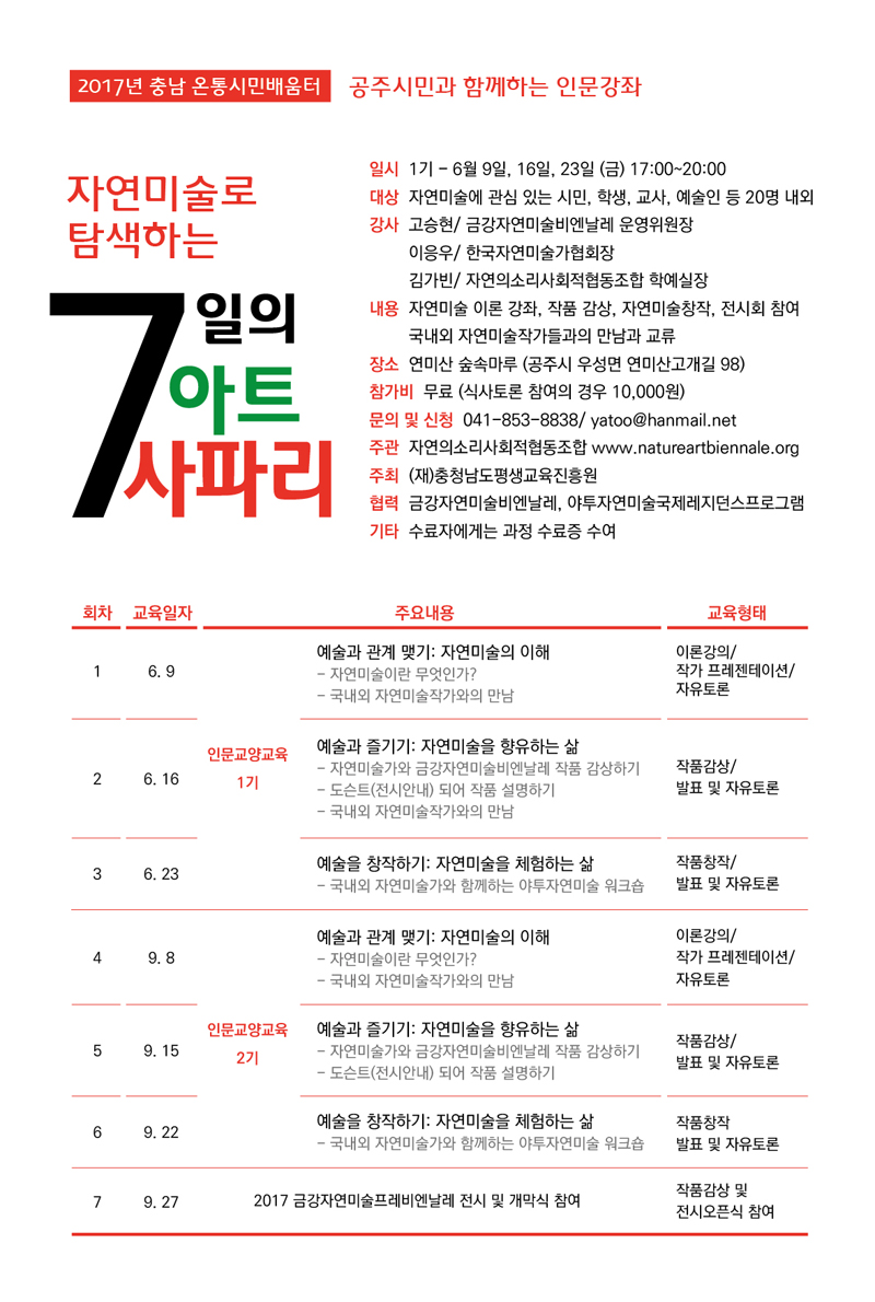 | 84 | 공주시민과 함께하는 인문강좌 / 자연의소리사회적협동조합 | 교육체육과 | 775 | 2017-06-07 | 7일의아트사파리.jpg |