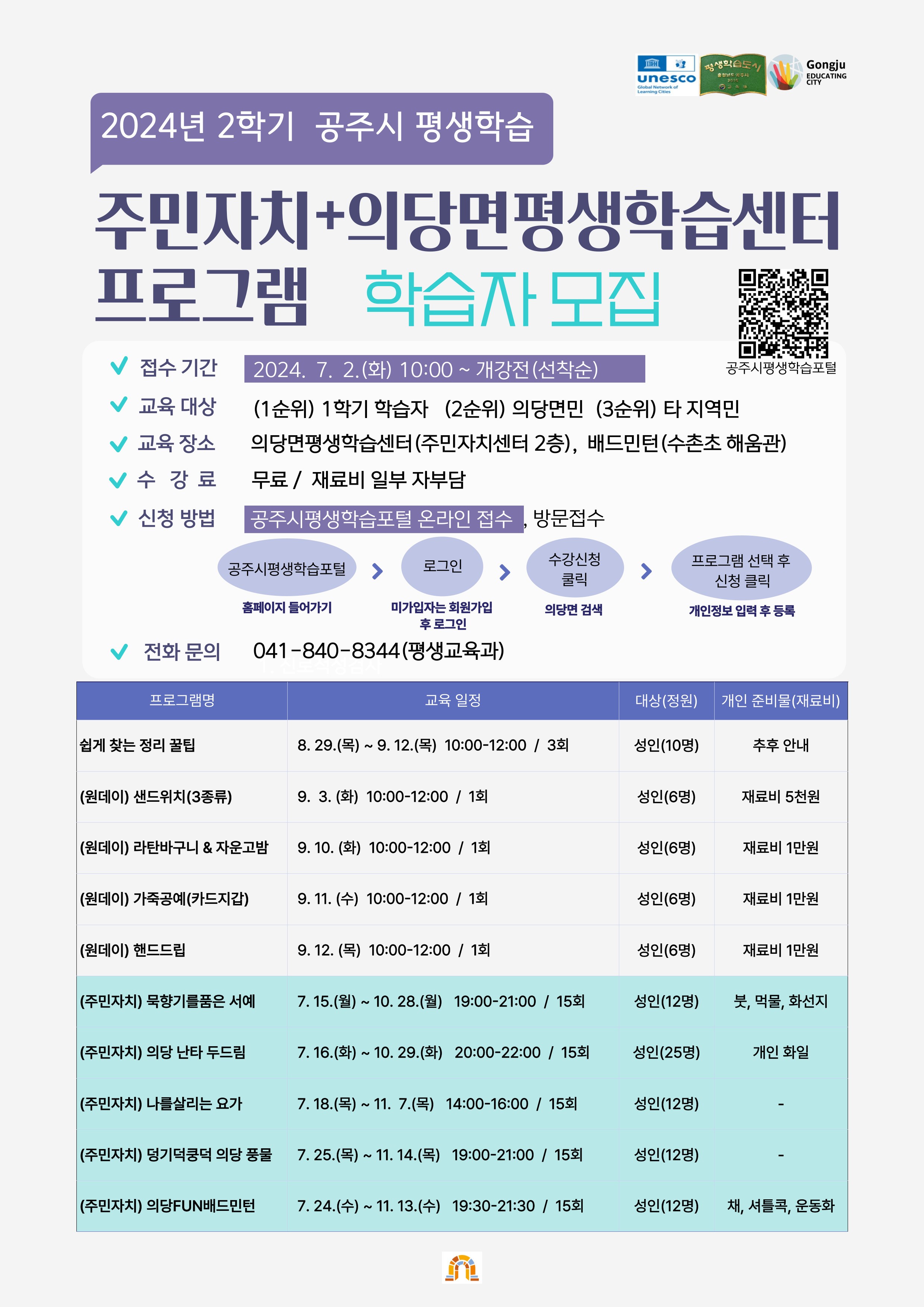 | 345 | 2024년 2학기 의당면평생학습센터 학습자 모집 | 평생교육과 | 966 | 2024-07-01 | 2학기 의당면평생학습센터 홍보지.jpg |
