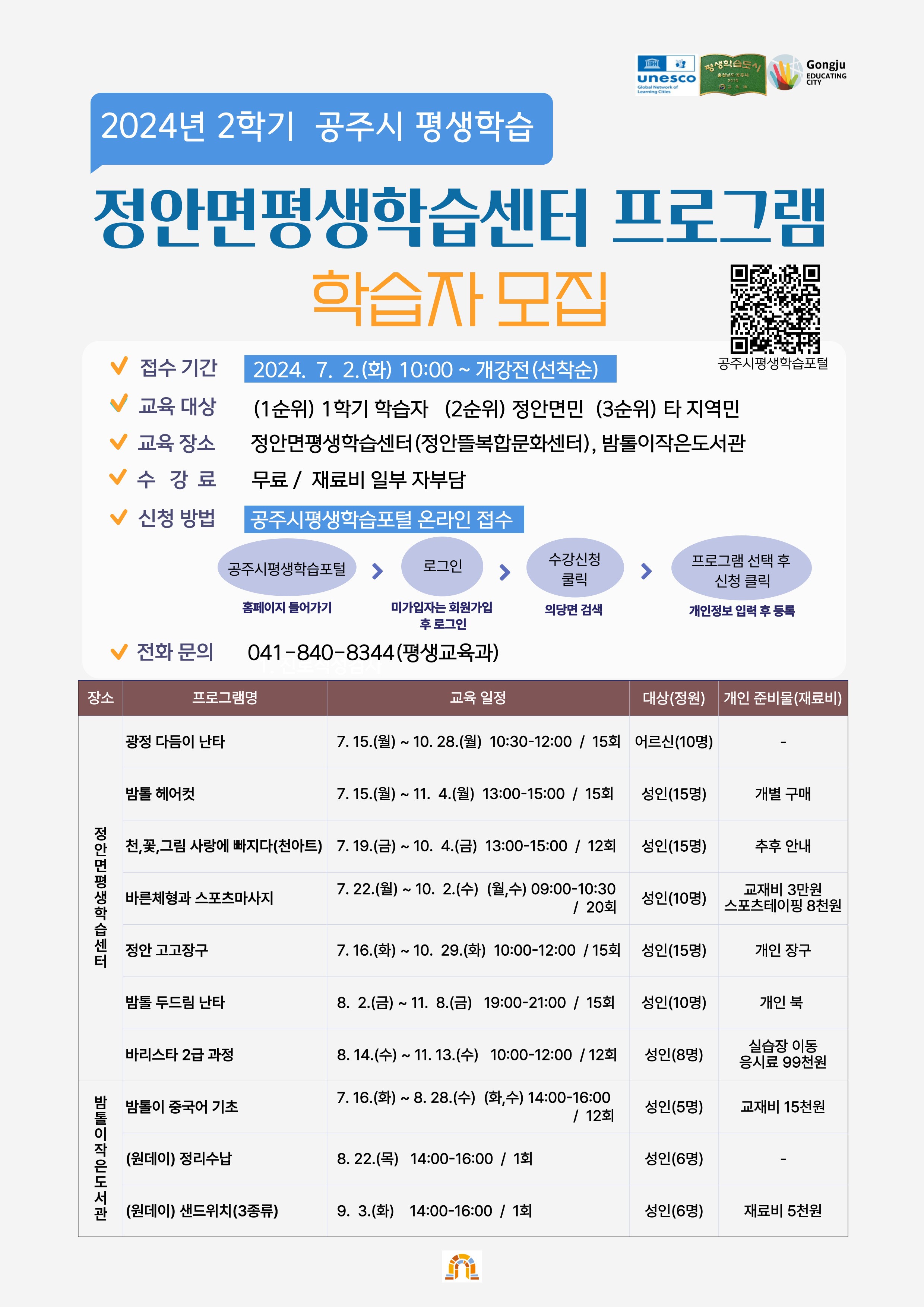 | 346 | 2024년 2학기 정안면평생학습센터 학습자 모집 | 평생교육과 | 1,061 | 2024-07-01 | 2학기 정안면평생학습센터 홍보지.jpg |