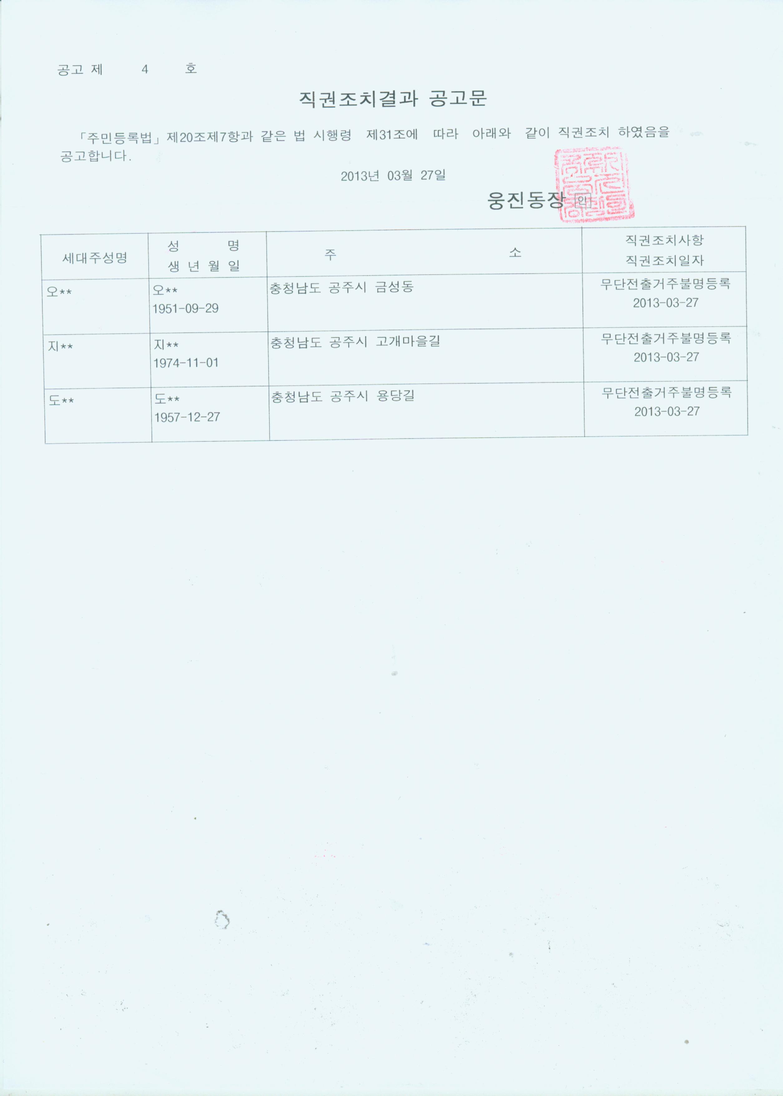 | 29 | 무단전출에 따른 직권조치 결과 공고 | 웅진동 | 4,243 | 2013-03-27 | 직권조치 공고문.jpg |