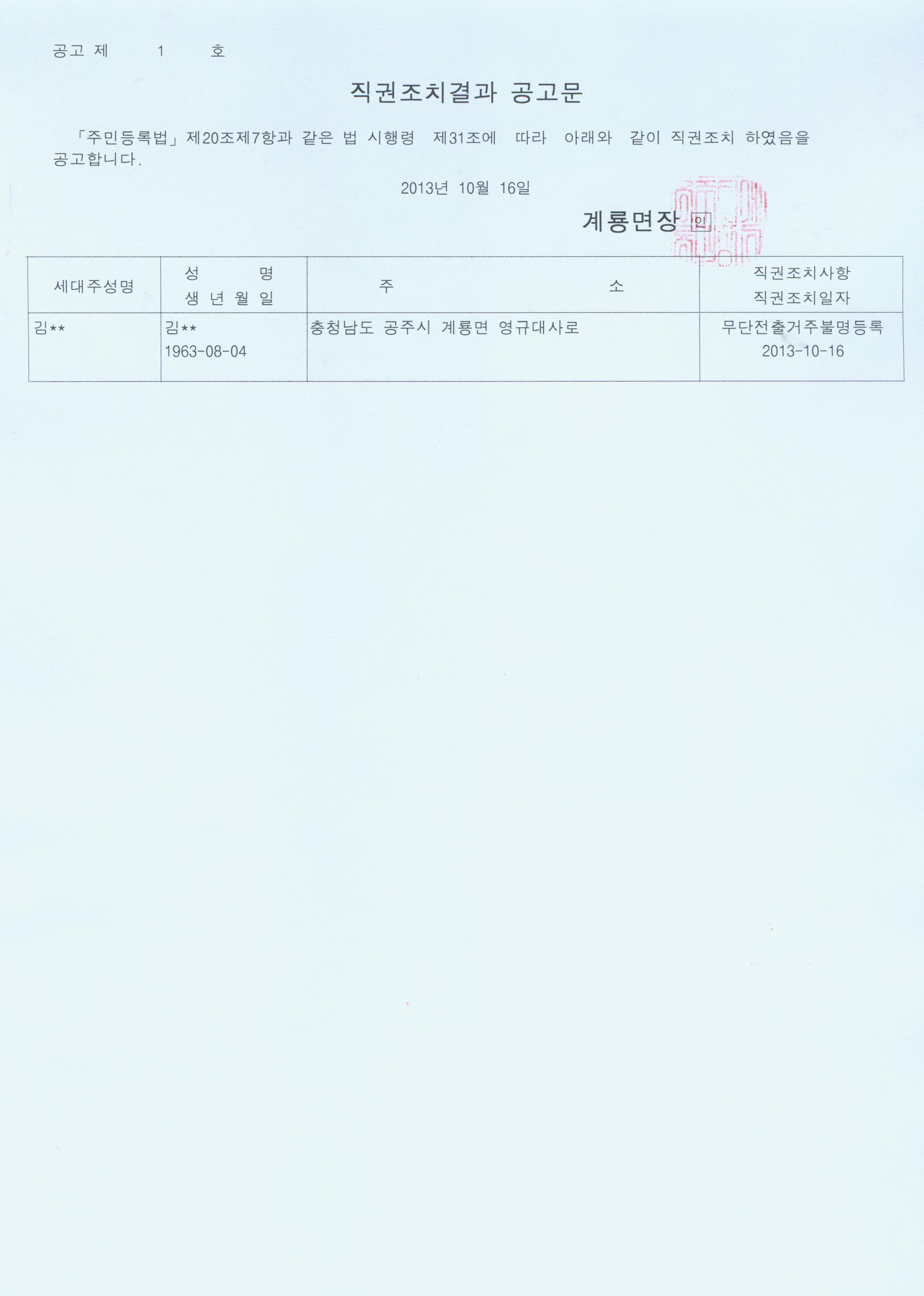 | 5581 | 거주불명등록자 직권조치 결과 알림 | 계룡면 | 651 | 2013-10-16 | 직권조치결과공고.jpg |