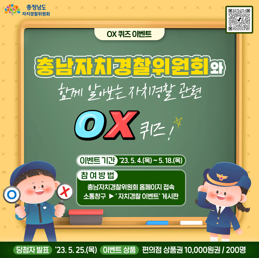 | 914 | 충청남도자치경찰위원회 홈페이지 퀴즈 이벤트 | 전체관리자 | 232 | 2023-05-04 | 충남자치경찰 OX퀴즈 이벤트 포스터.png |