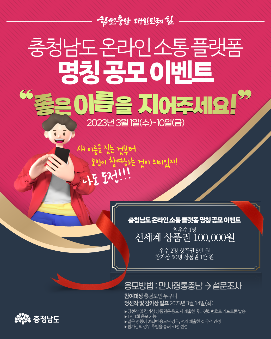 | 891 | 충청남도 온라인 소통 플랫폼 명칭 공모 이벤트 | 전체관리자 | 150 | 2023-03-03 | 온라인 소통 플랫폼 명칭 공모 이벤트 웹포스터.png |