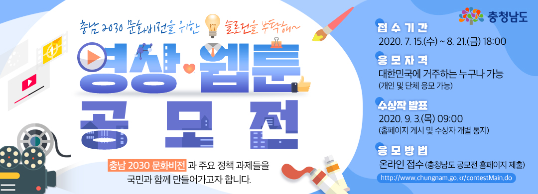 | 671 | 충남 2030 문화비전 수립 영상/웹툰 공모전 알림 | 문화체육과 | 58 | 2020-07-22 | 공모전 배너 이미지.jpg |