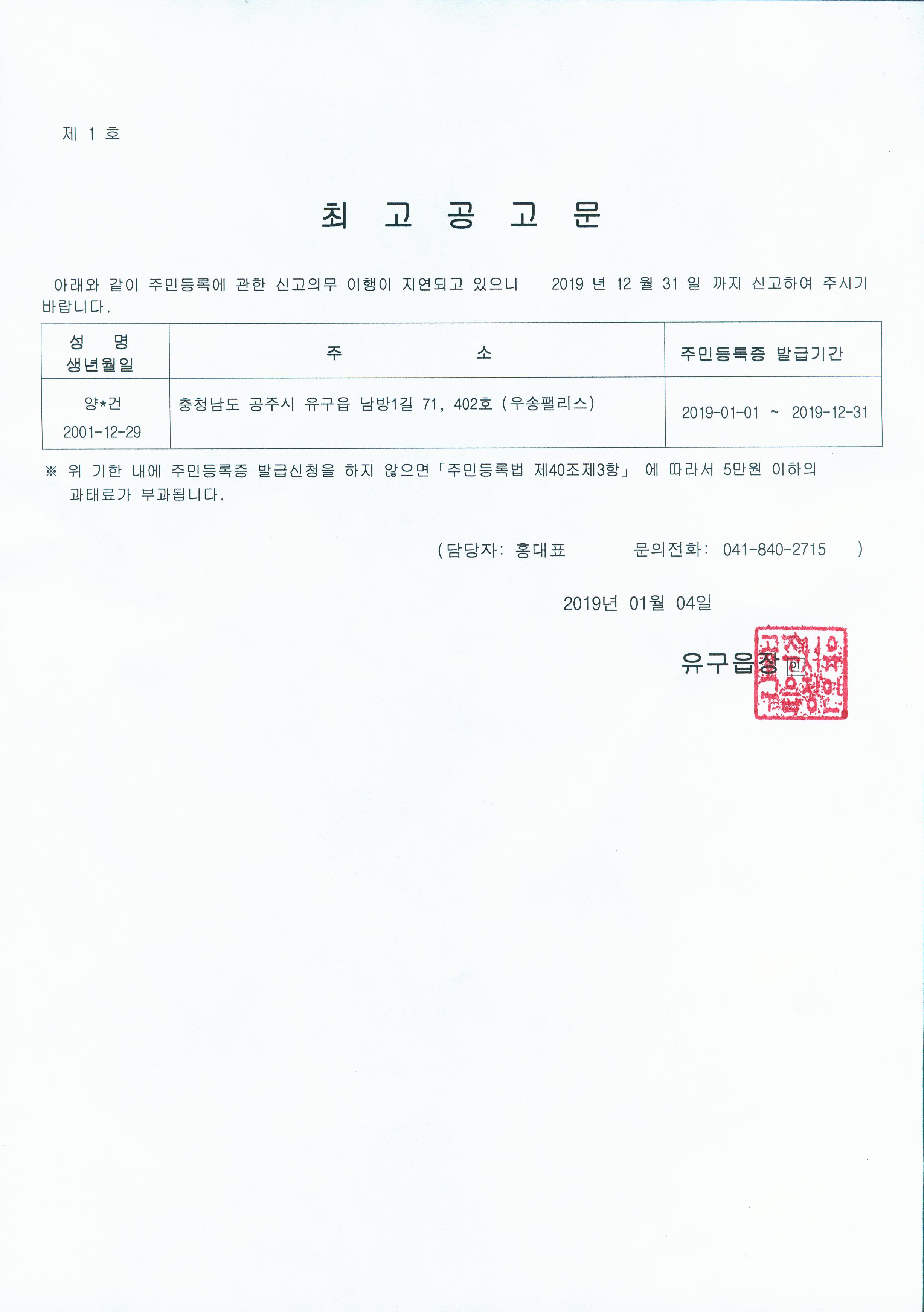 | 301 | 신규주민등록증 발급대상자공고 | 유구읍 | 211 | 2019-01-04 | 양o건 주민등록증 최고공고문.jpg |