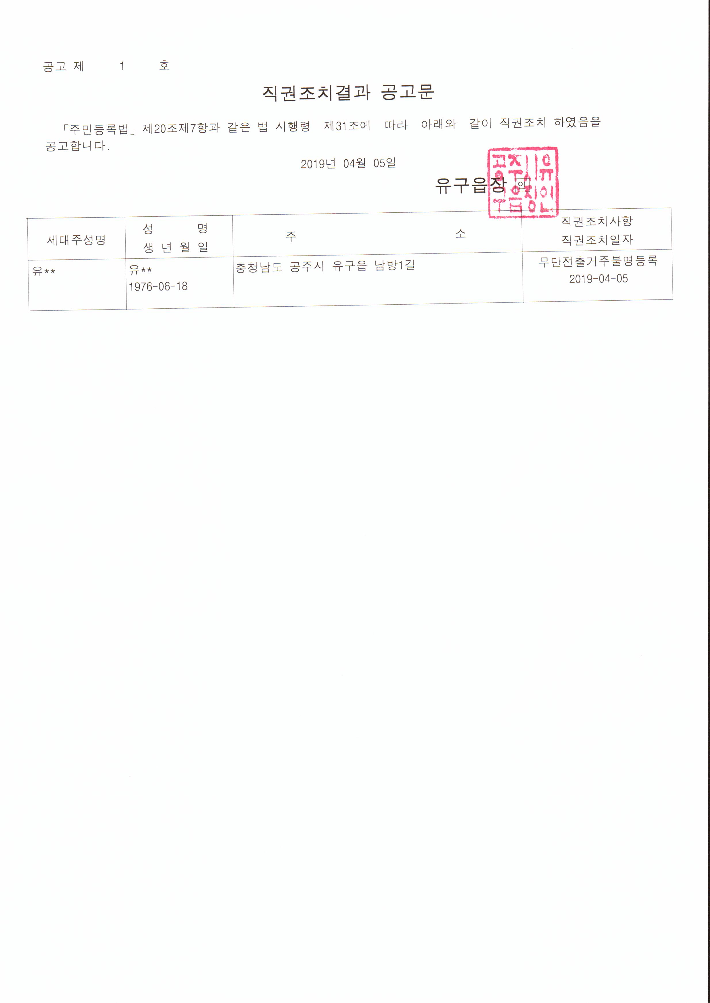 | 306 | 주민등록 거주불명 직권조치결과 공고 | 유구읍 | 212 | 2019-04-05 | 직권조치결과 공고문.jpg |