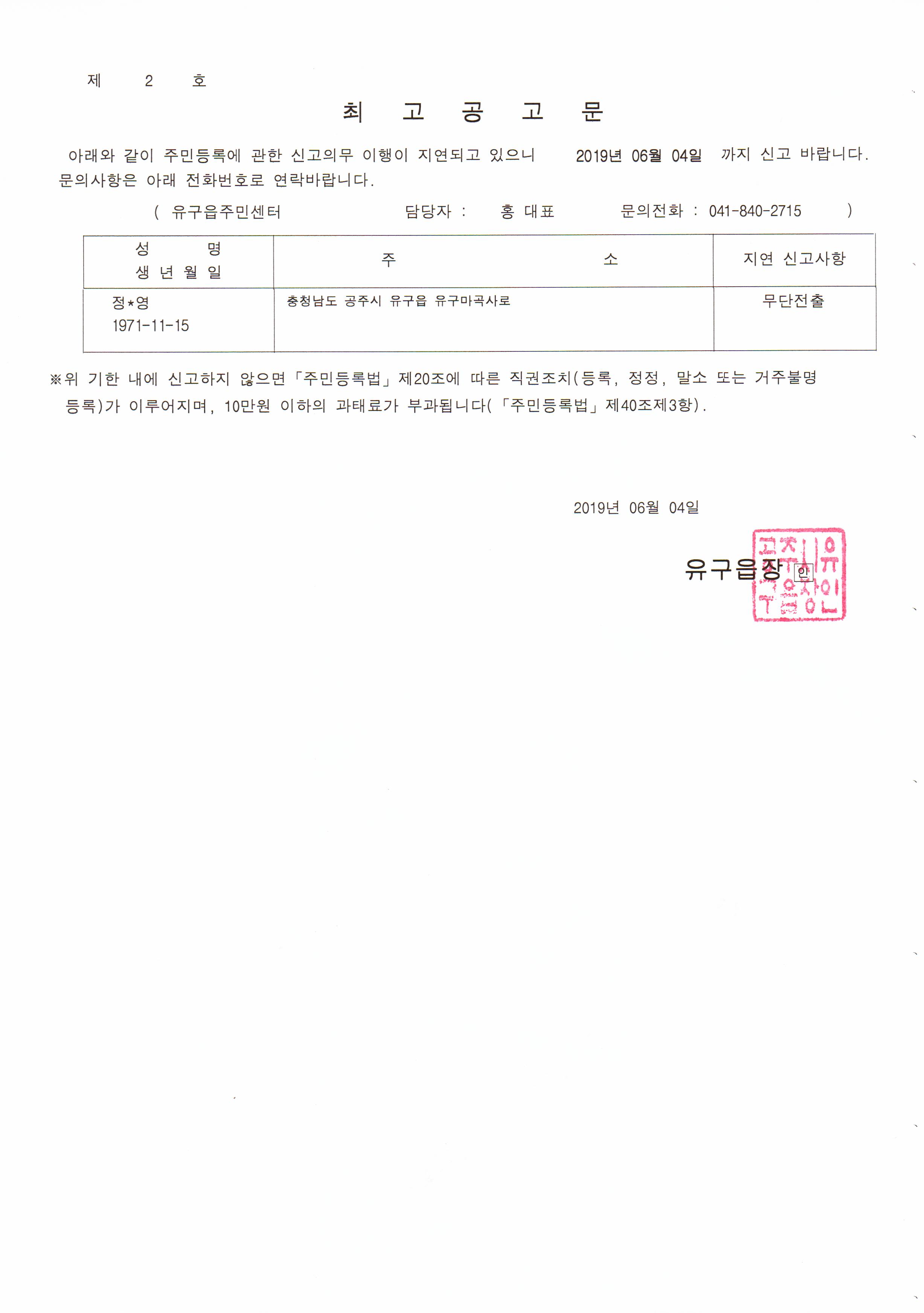 | 307 | 주민등록 무단전출자에 대한 최고공고 | 유구읍 | 146 | 2019-06-04 | 최고공고문.jpg |