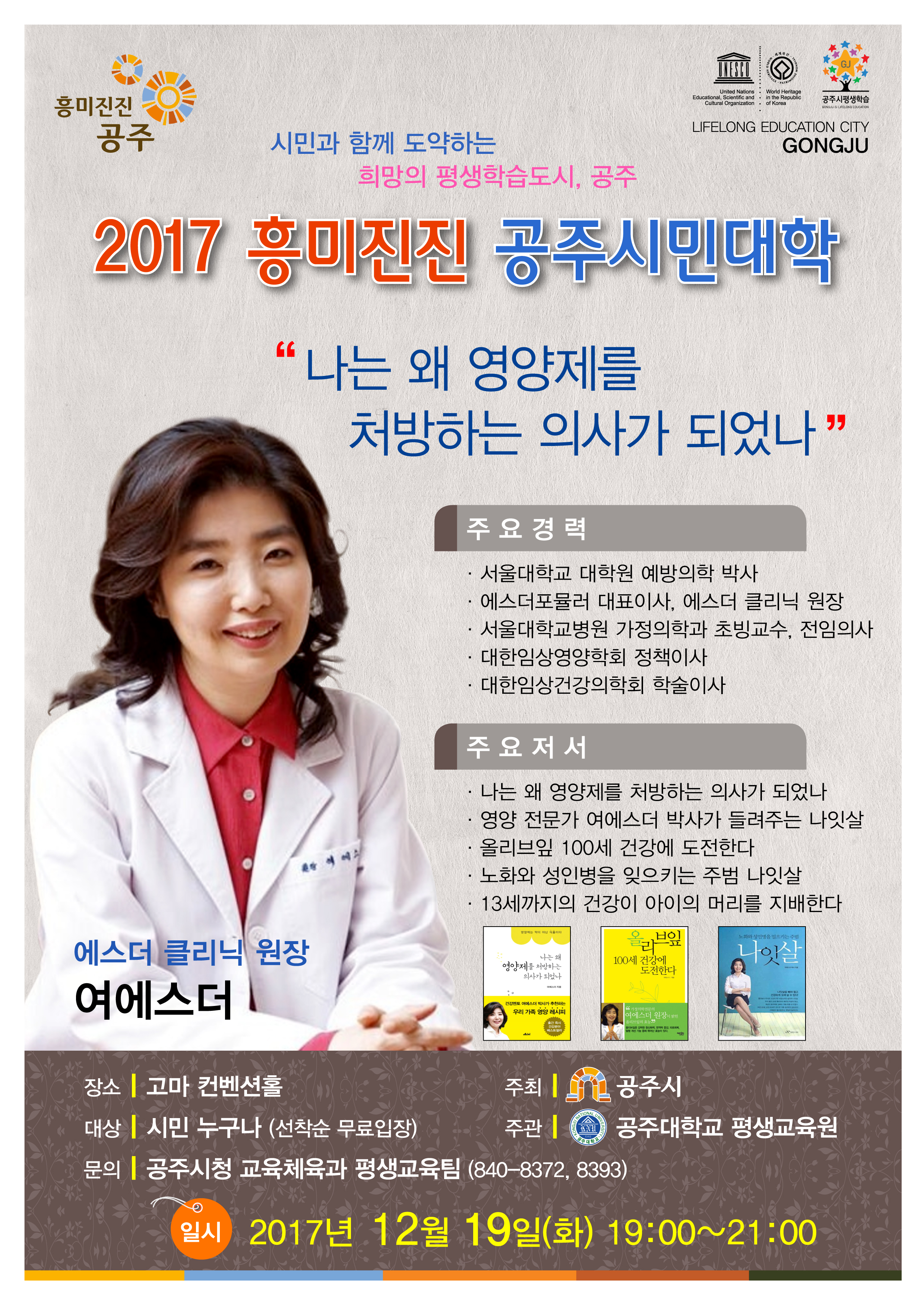 | 400 | 2017 흥미진진, 공주시민대학 제40강 안내("나는 왜 영양제를 처방하는 의사가 되었나" 여에스더 원장) | 탄천면 | 227 | 2017-12-12 | 홍보문.jpg |
