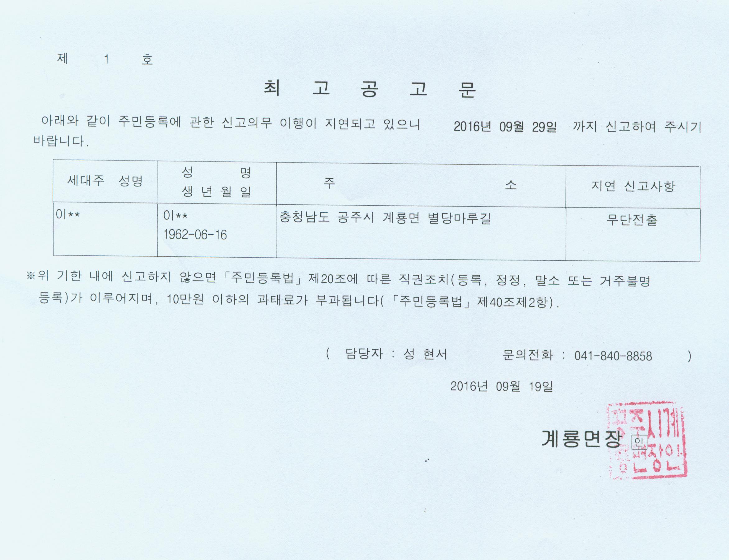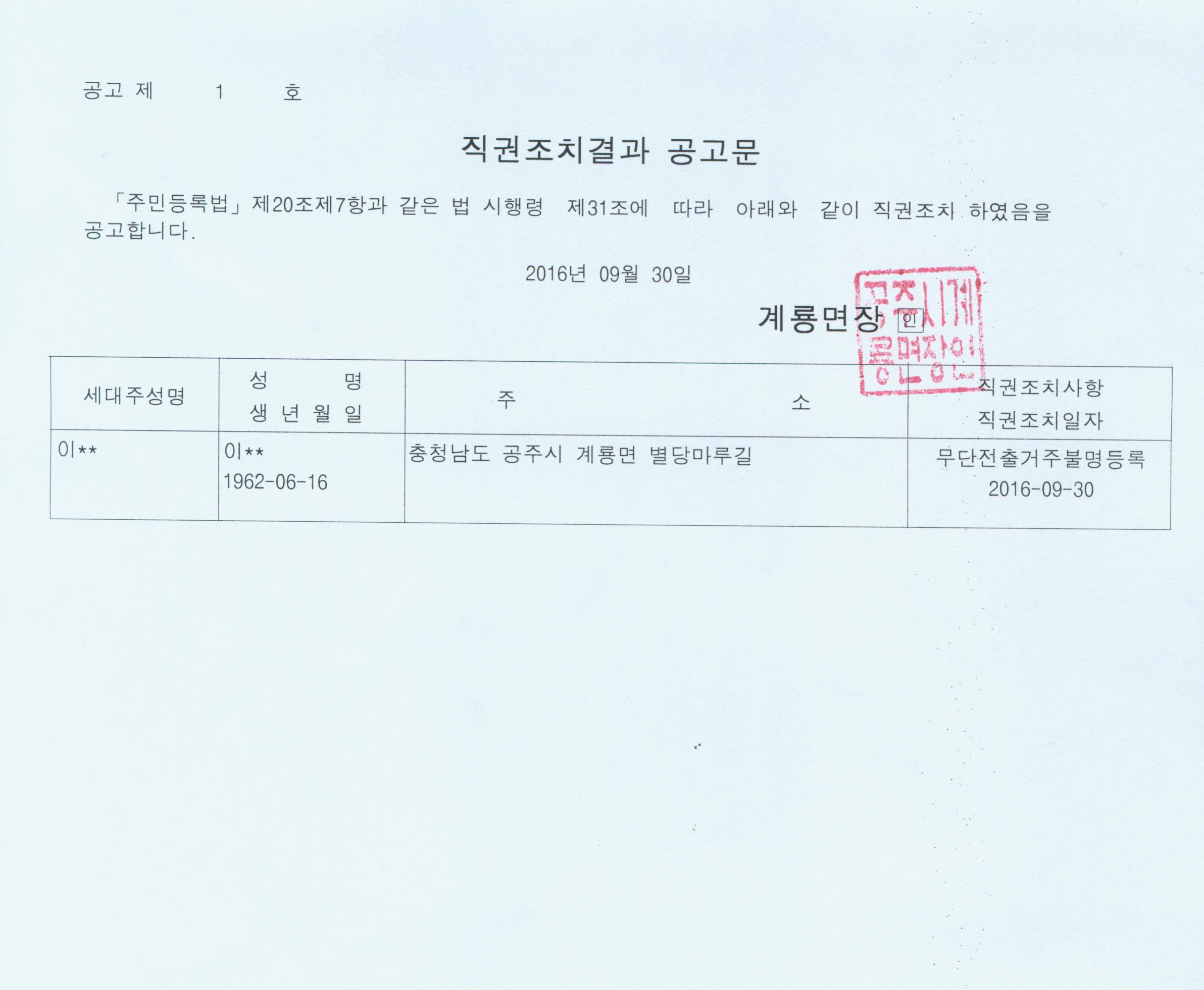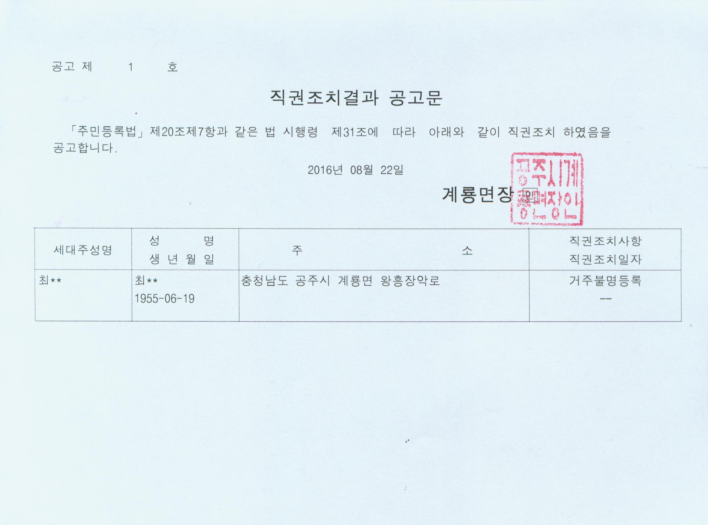 | 255 | 주민등록 직권조치(거주불명등록) 결과 공고 | 계룡면 | 267 | 2016-08-22 | 직권조치결과 공고문.jpg |