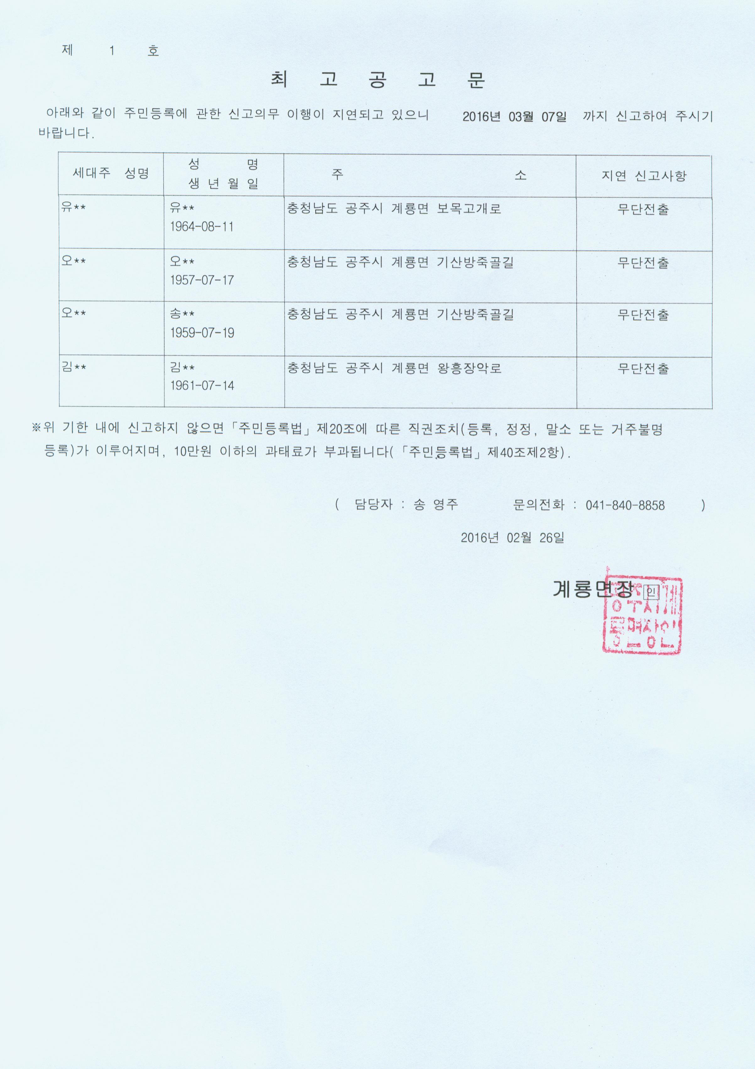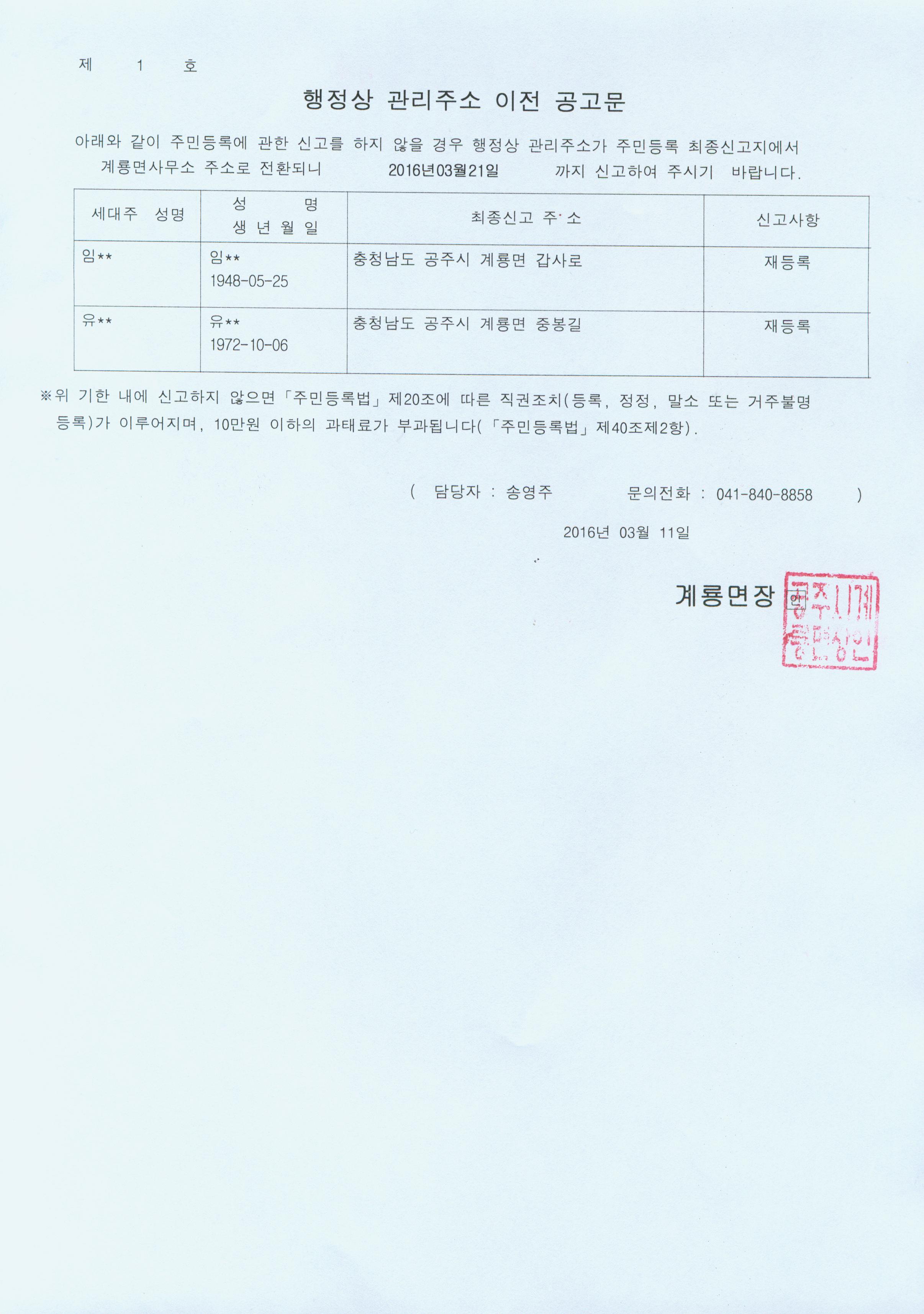 | 222 | 주민등록 거주불명등록자 행정상 관리주소 이전 1차 공고 | 계룡면 | 449 | 2016-03-14 | 행정상 관리주소 이전 공고문.jpg |