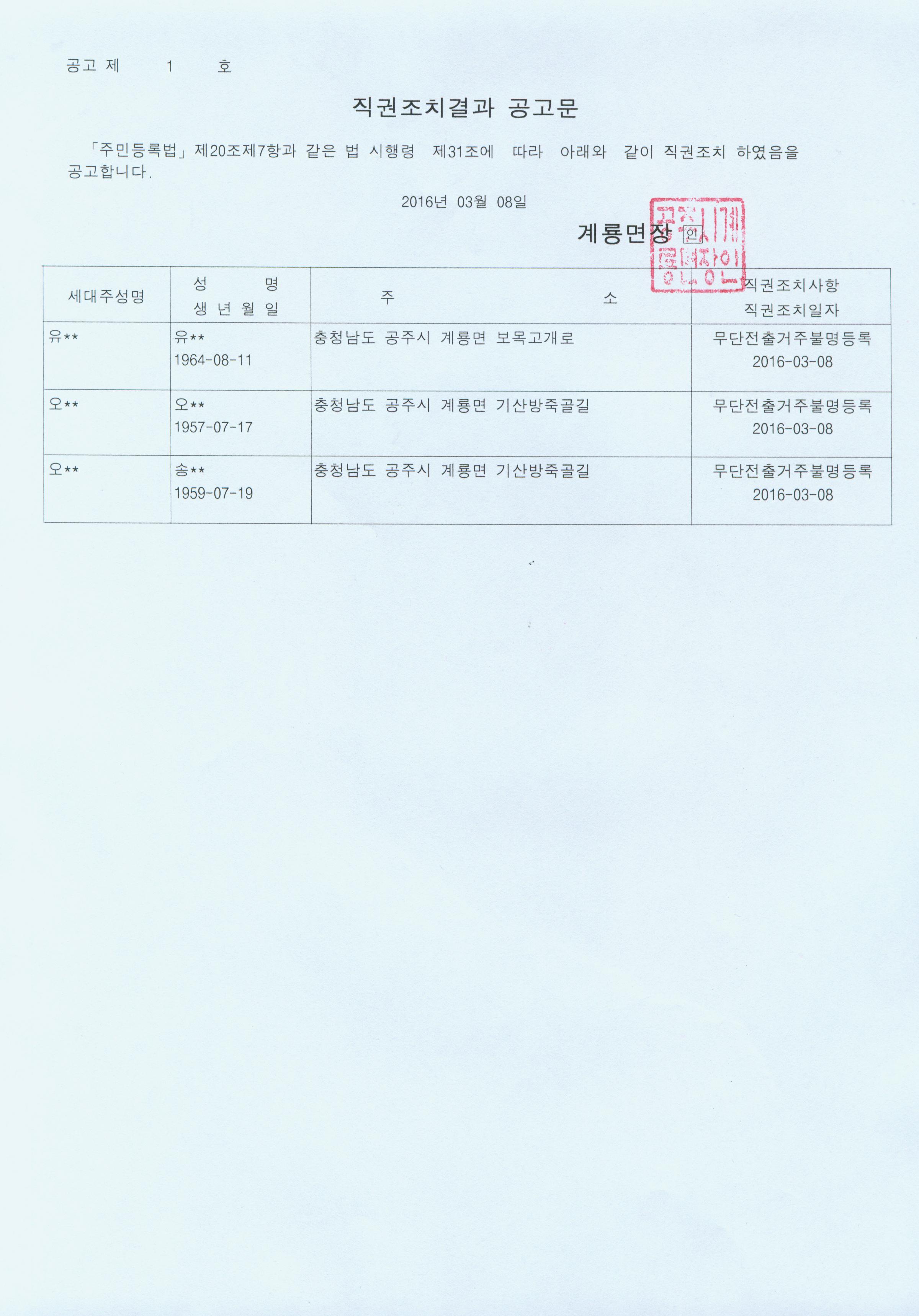 | 221 | 주민등록 직권조치(거주불명등록) 결과 공고 | 계룡면 | 442 | 2016-03-08 | 직권조치결과공고문.jpg |
