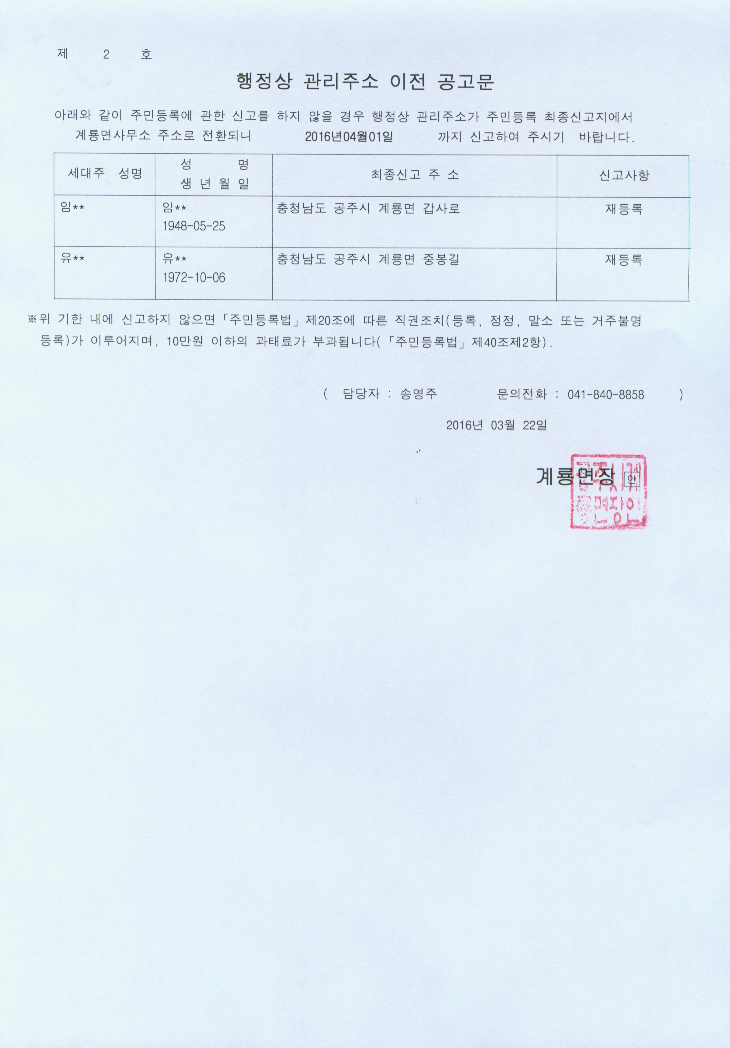| 224 | 주민등록 거주불명등록자 행정상 관리주소 이전 2차 공고 | 계룡면 | 431 | 2016-03-23 | 행정상 관리주소 이전 2차 공고문 .jpg |