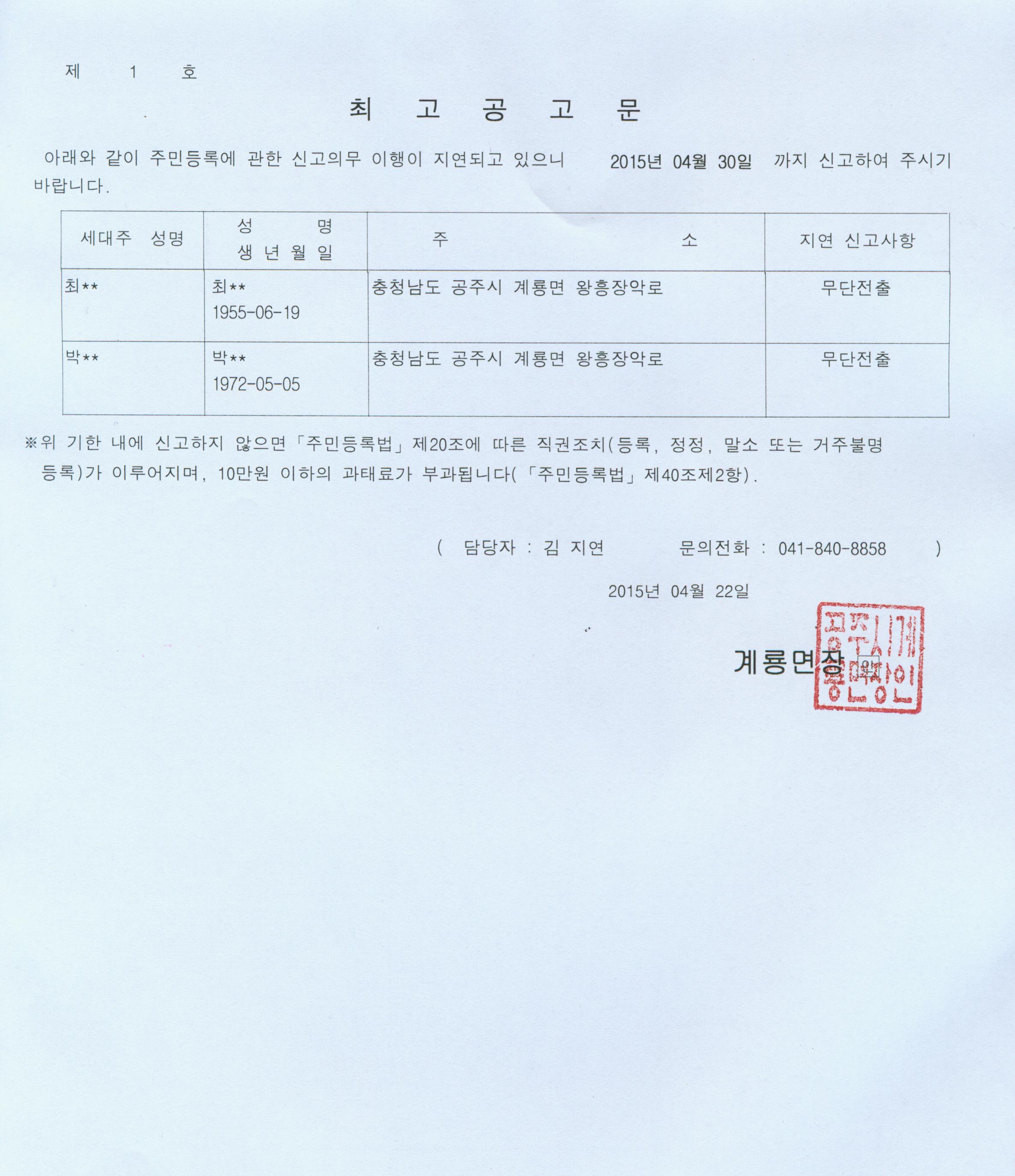 | 182 | 주민등록 무단 전출자에 대한 직권 거주불명등록 최고공고 | 계룡면 | 763 | 2015-04-22 | 최고공고문.jpg |