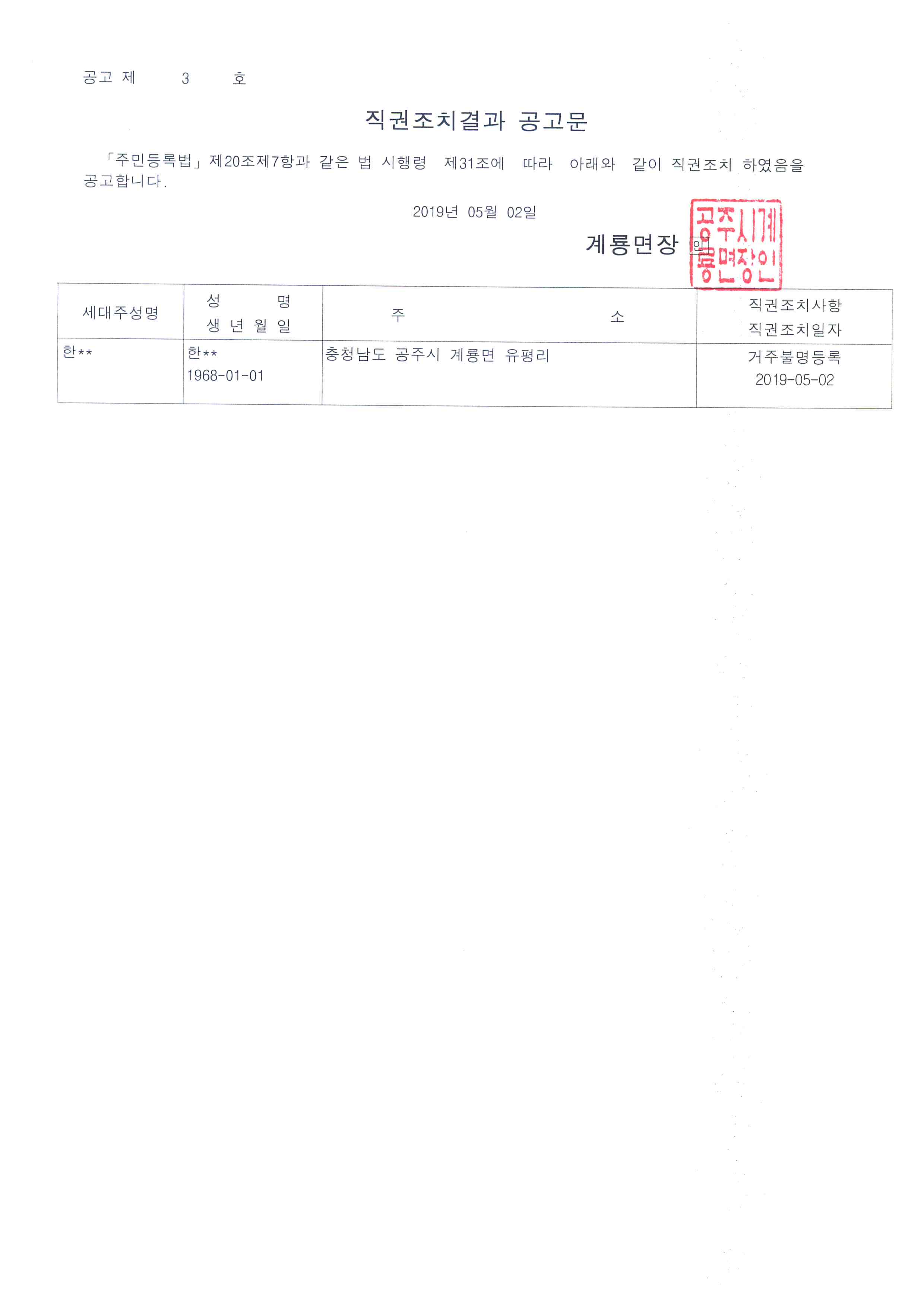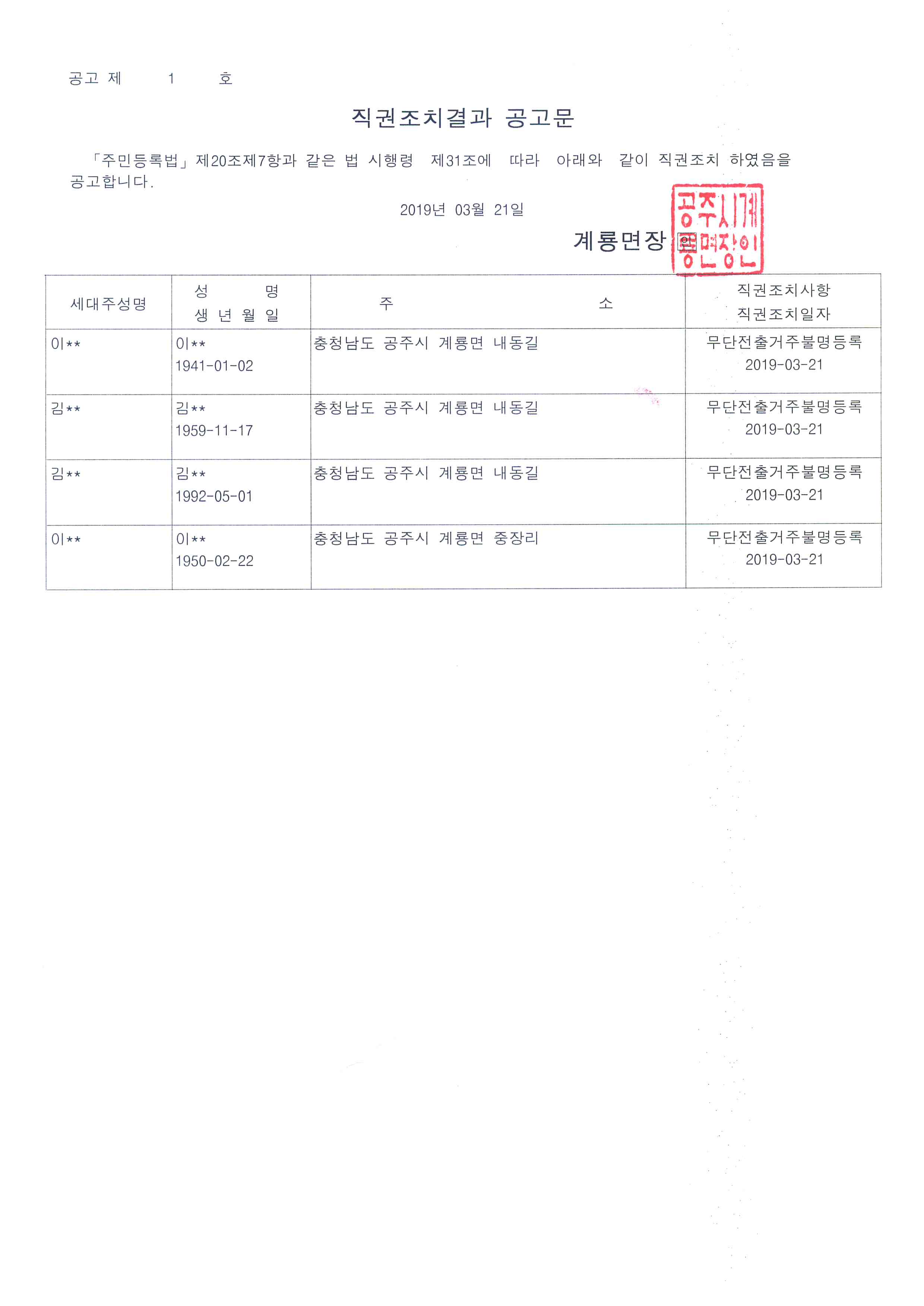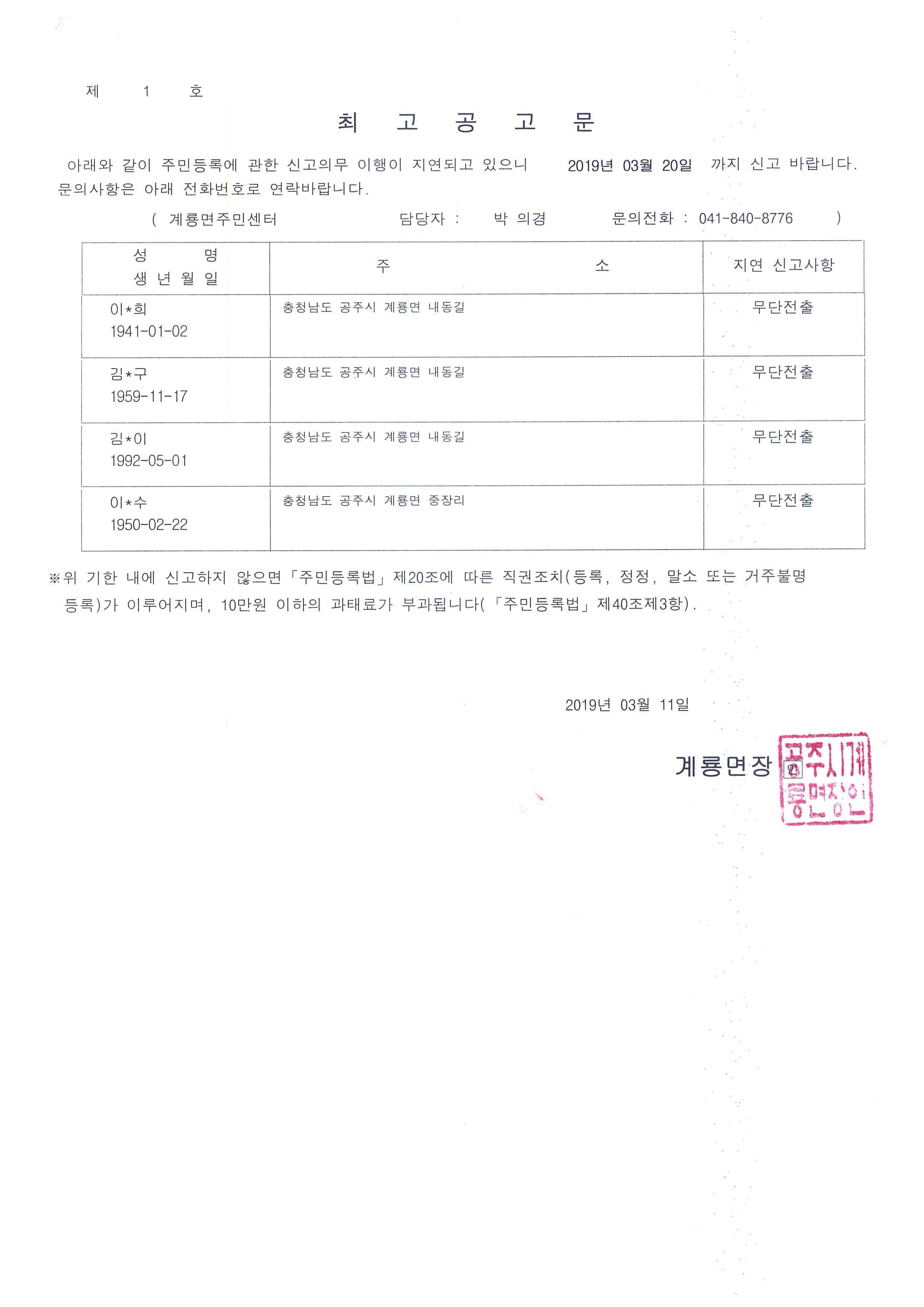 | 361 | 주민등록 무단전출자(거주불명등록) 직권조치 공고 | 계룡면 | 141 | 2019-03-21 | 직권조치결과 공고문.jpg |