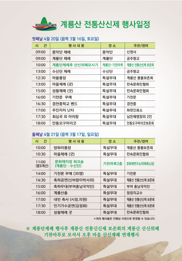 | 363 | 계룡면 산신제 개최 알림 | 계룡면 | 357 | 2019-04-02 | 계룡산 산신제 행사일정.PNG |