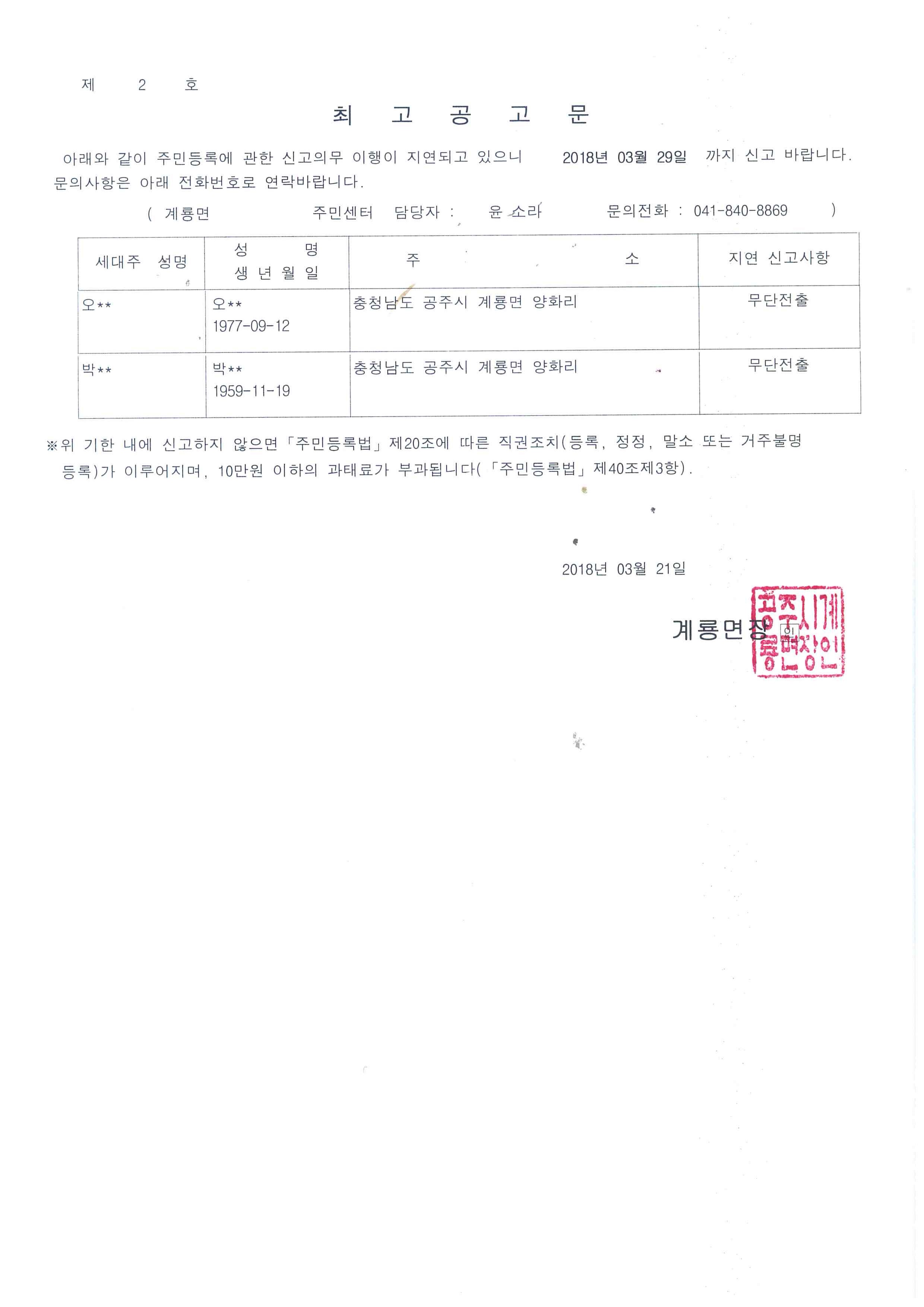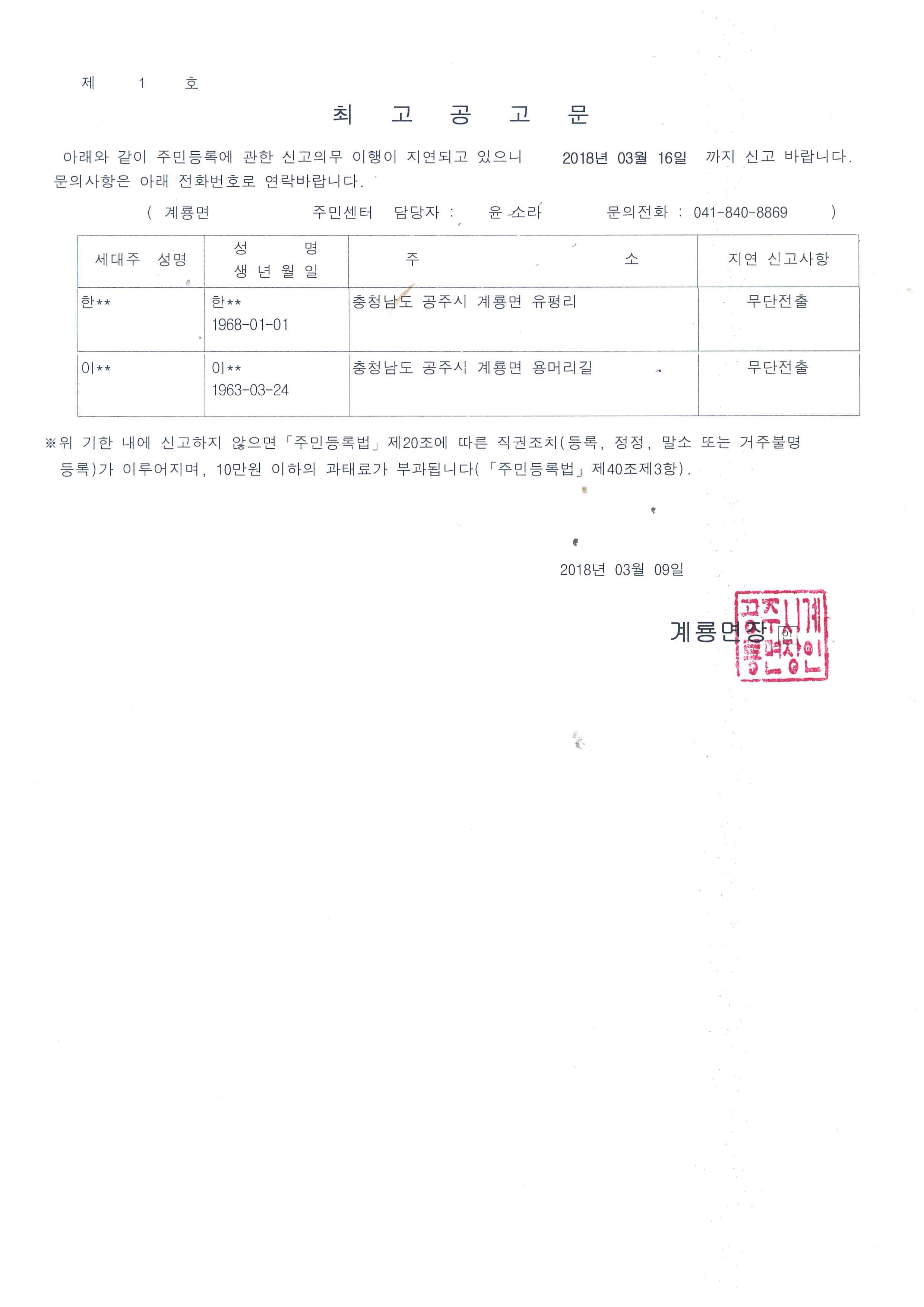 | 327 | 주민등록 거주불명등록 최고공고 | 총무 | 178 | 2018-03-12 | 최고공고문.jpg |