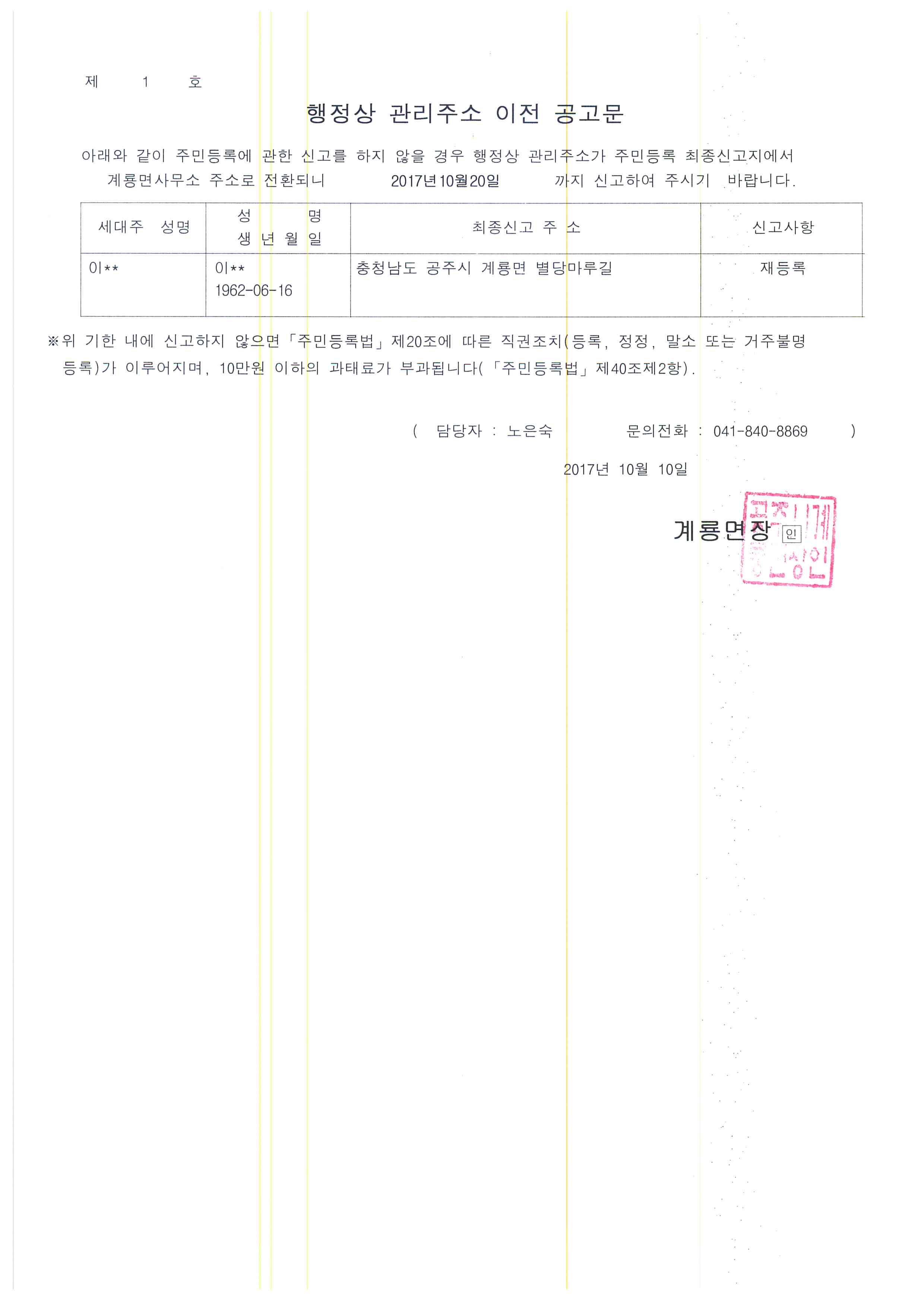 | 311 | 행정상 관리주소 이전 공고문 | 계룡면 | 171 | 2017-10-10 | 행정상 관리주소 이전 공고문.jpg |