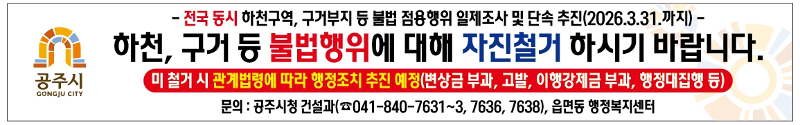 | 875 | 하천, 구거 등 불법 점용시설 일제조사 실시 안내 | 반포면 | 76 | 2026-03-10 | 불법 점용 시설.png |