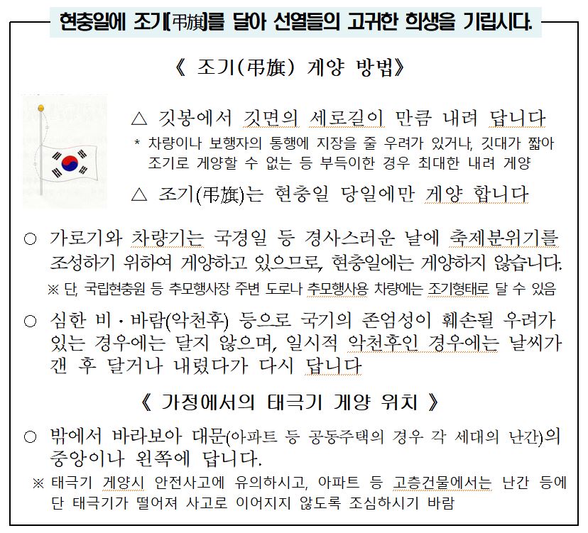| 437 | 제68주년 현충일 '나라사랑 태극기[弔旗]달기 운동' 안내 | 반포면 | 25 | 2023-06-05 | 조기게양방법.JPG |