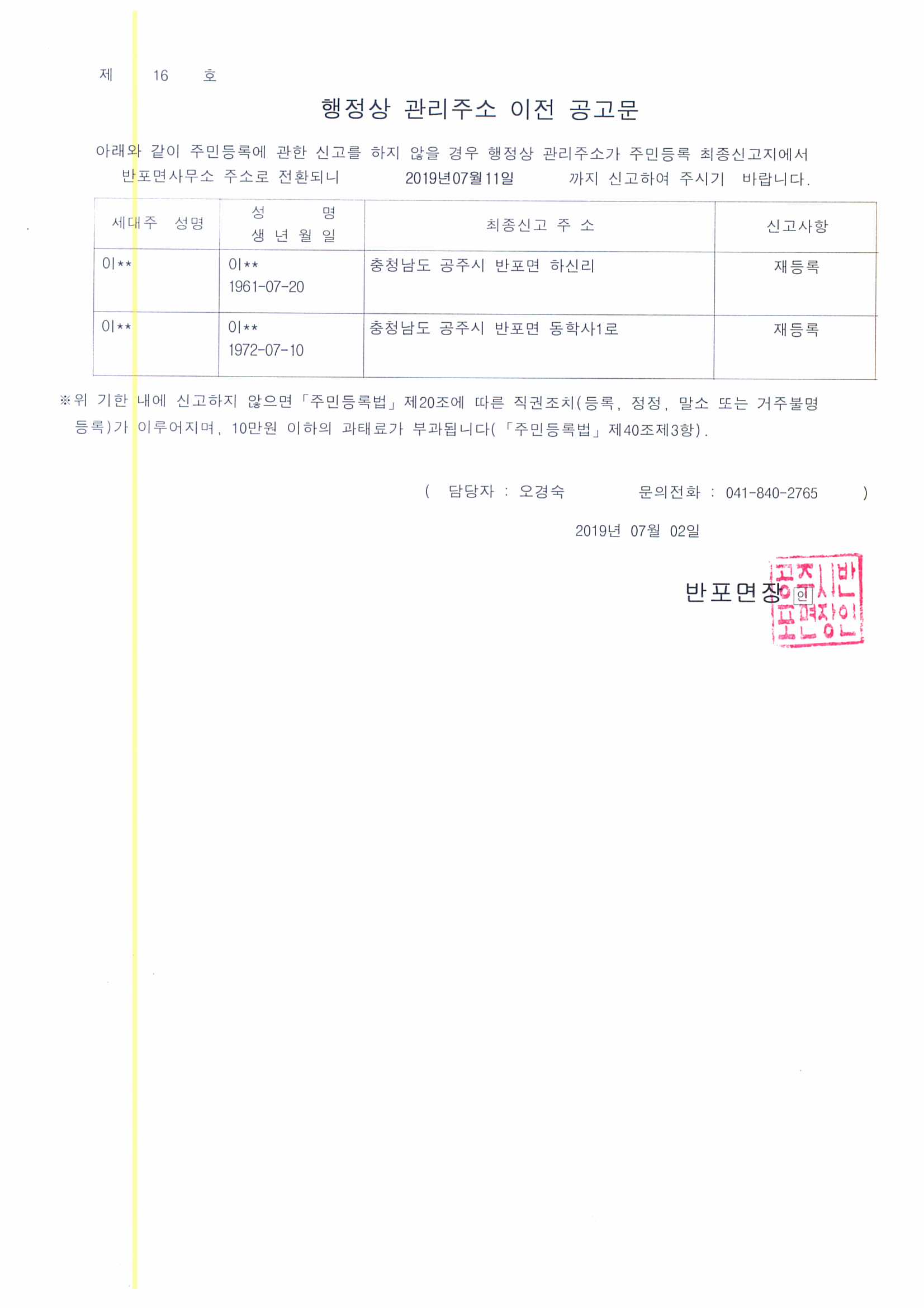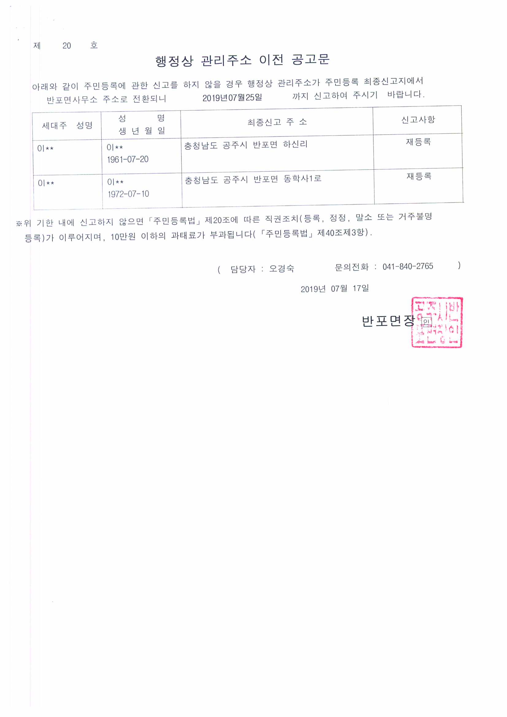 | 213 | 행정상 관리주소 이전 공고문(2차) | 반포면 | 129 | 2019-07-17 | 행정상 관리주소 이전 공고문.jpg |