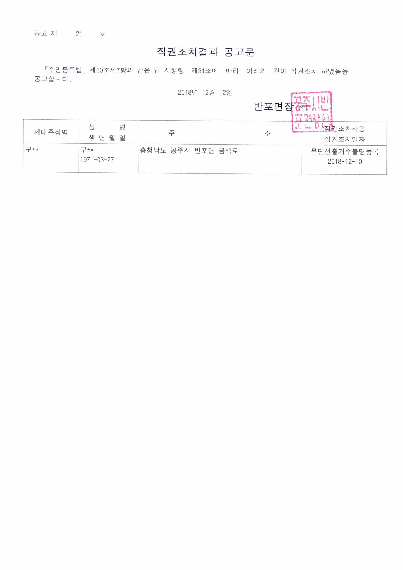 | 194 | 주민등록 무단전출자의 직권조치 결과 공고 | 반포면 | 143 | 2018-12-12 | 직권조치결과 공고문.jpg |