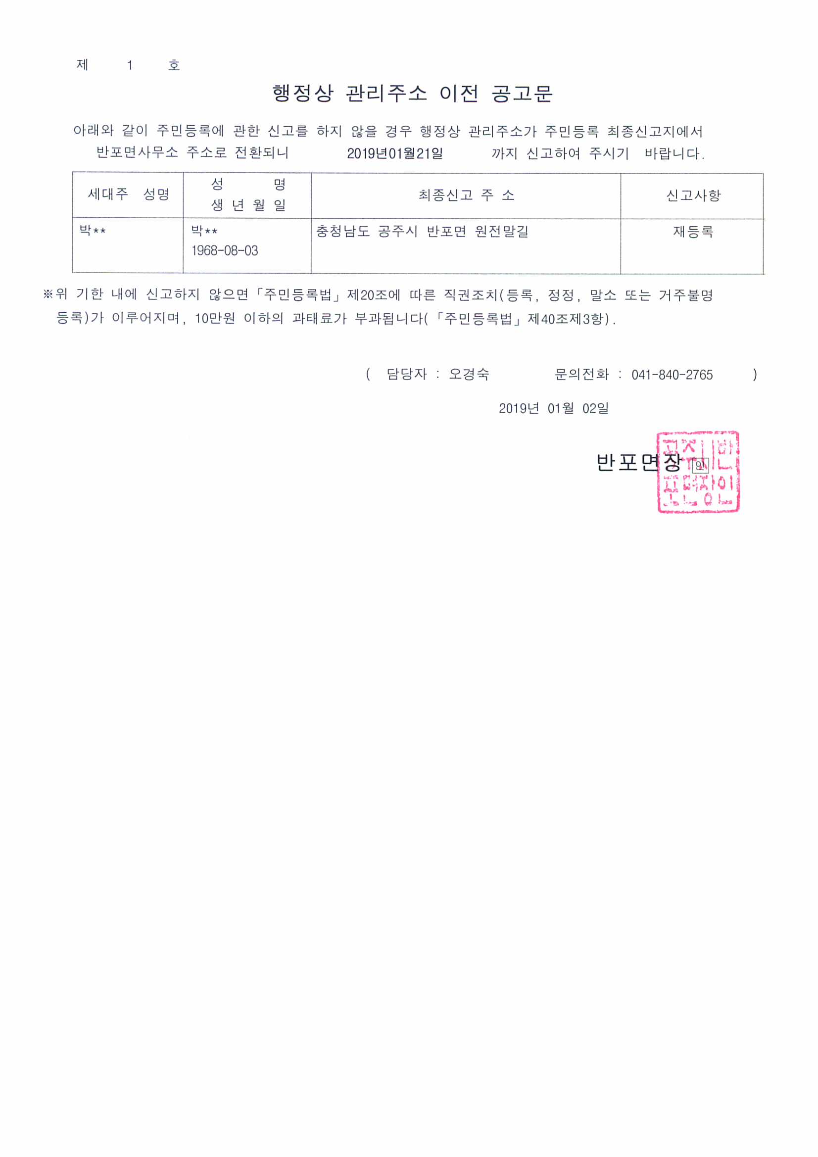 | 195 | 거주불명등록자 행정상 관리주소 이전 공고(1차) | 오경숙 | 138 | 2019-01-02 | 행정상 관리주소 이전 공고문.jpg |