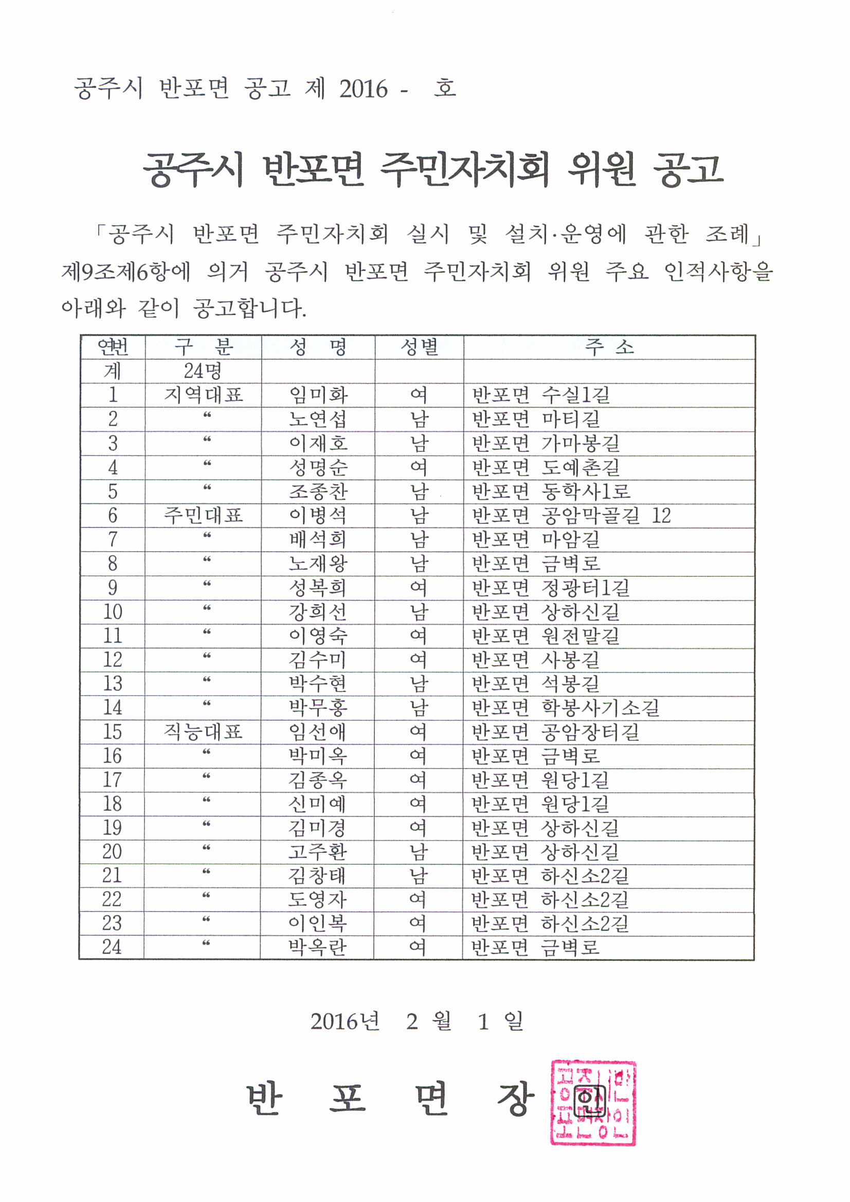 | 127 | 공주시 반포면 주민자치회 위원 인적사항 공고 | 반포면 | 978 | 2016-02-01 | 반포면 주민자치회 위원 인적사항 공고.jpg |
