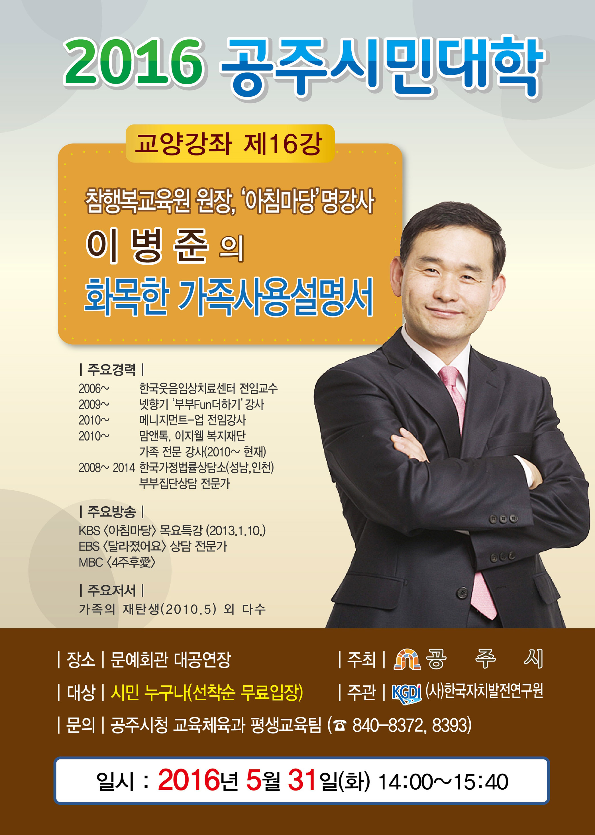 | 132 | 흥미진진, 공주시민대학 교양강좌(제16강) 안내 | 반포면 | 756 | 2016-05-27 | 전단지_16강_이병준.jpg |