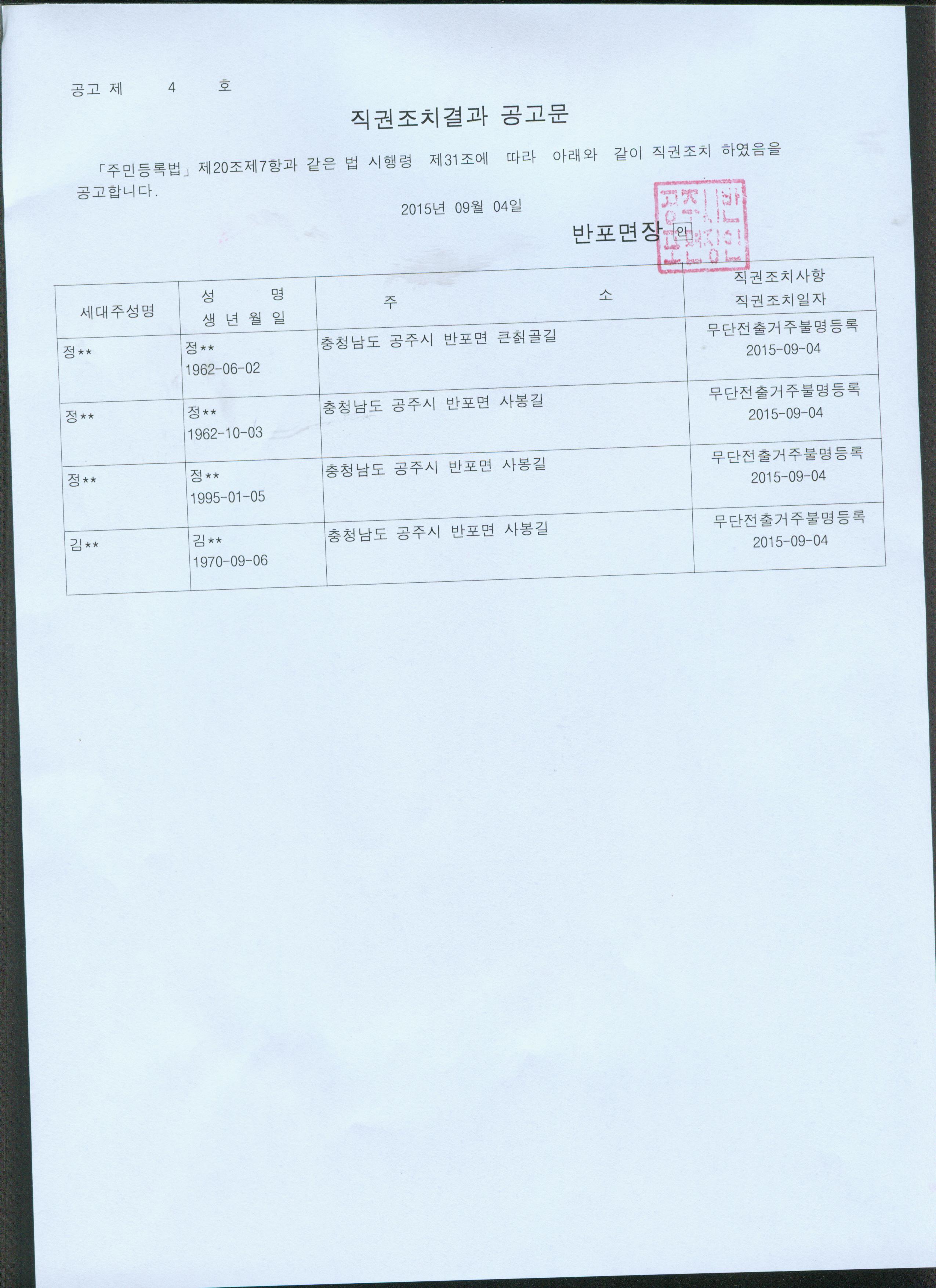 | 117 | 주민등록 거주불명등록 직권조치 결과 공고 | 반포면 | 1,127 | 2015-09-04 | 직권조치결과공고문.jpg |