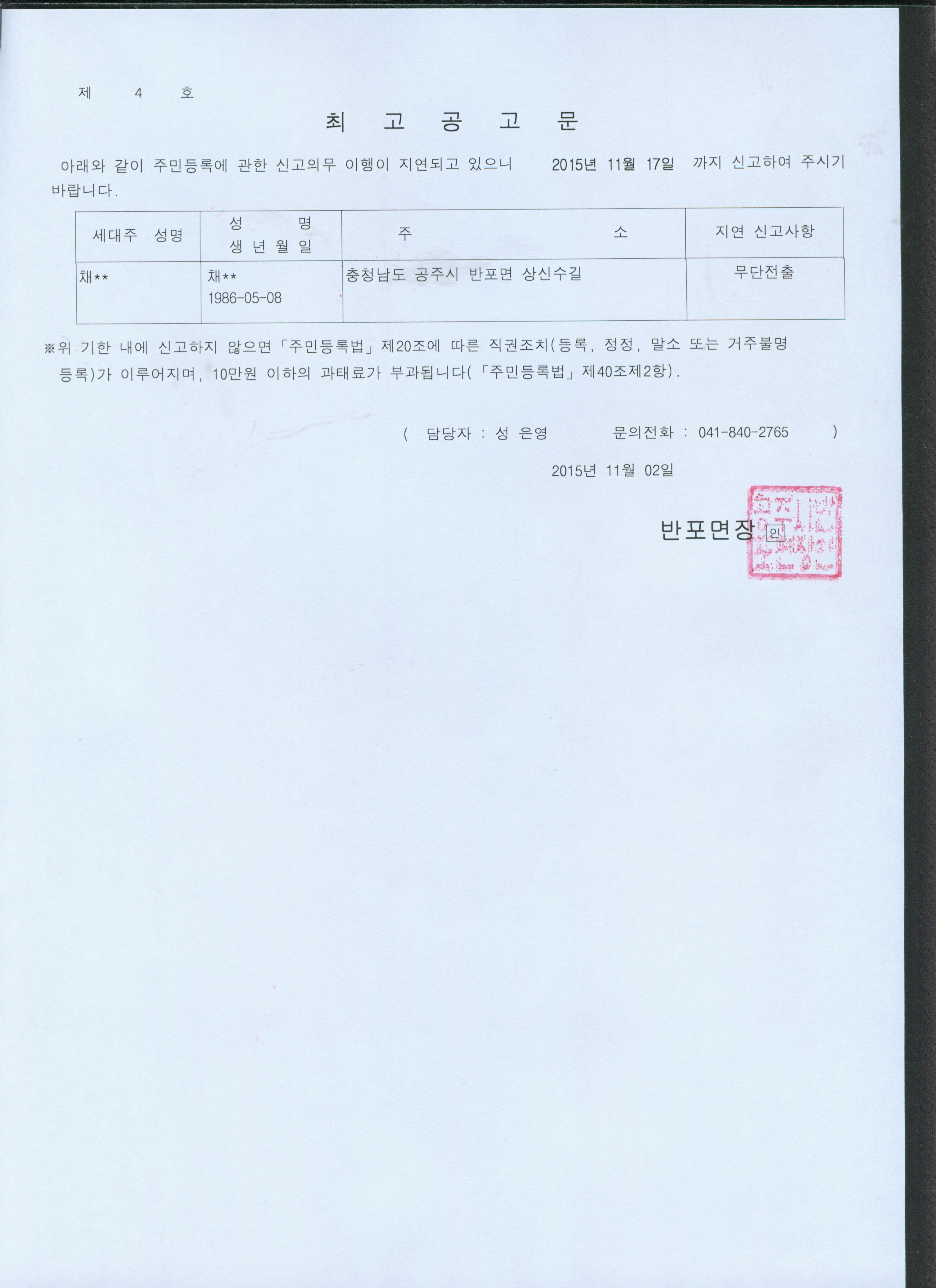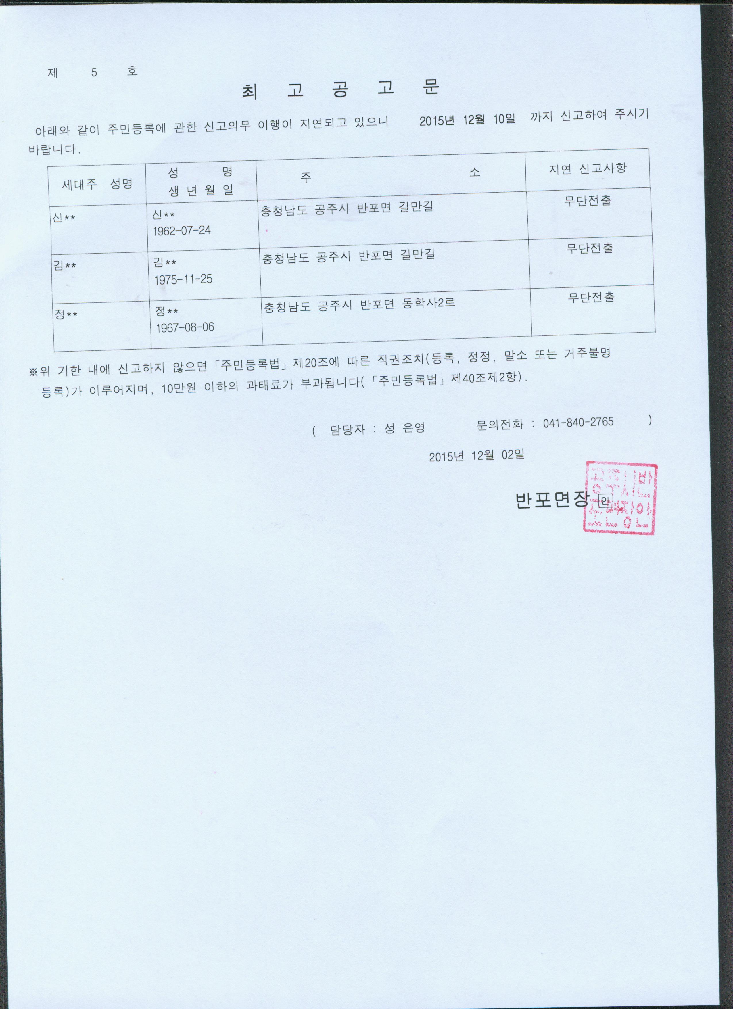 | 119 | 주민등록 거주불명등록 최고공고 | 반포면 | 966 | 2015-11-02 | 최고공고문.jpg |