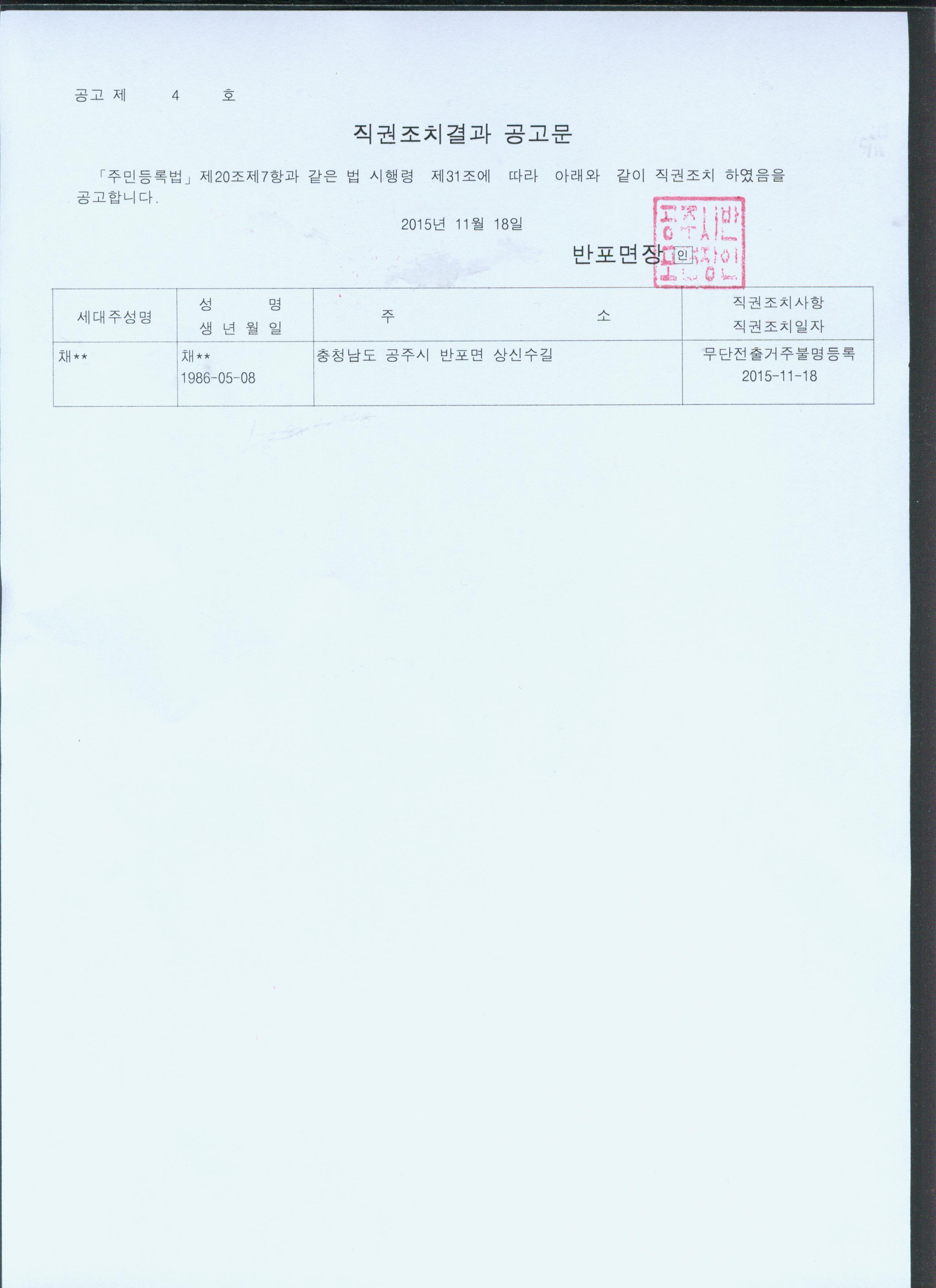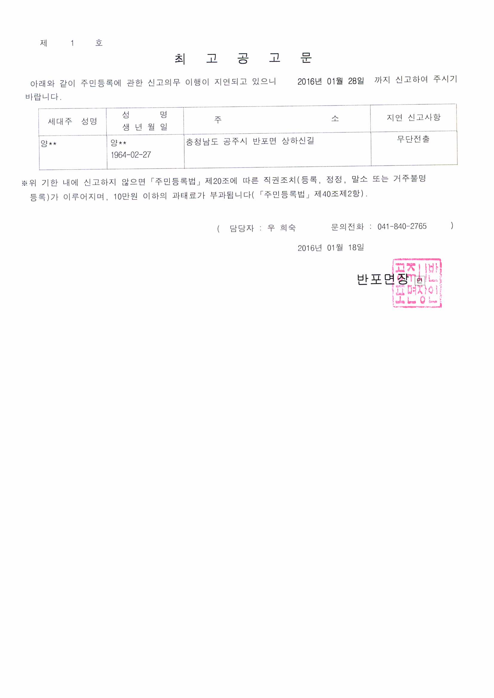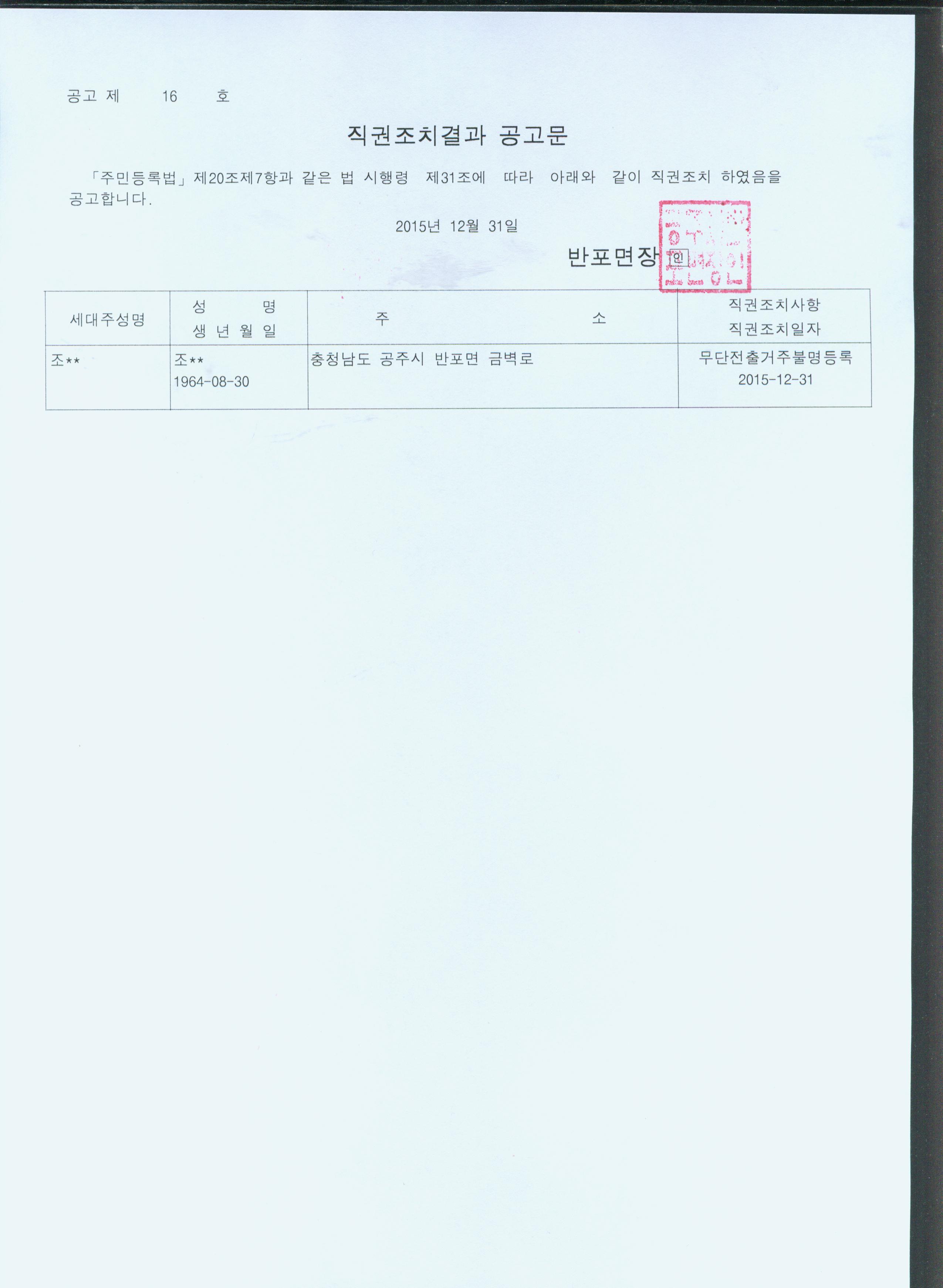| 125 | 주민등록 무단전출자 최고공고 | 반포면 | 872 | 2016-01-18 | doc00278220160118093500_001.jpg |