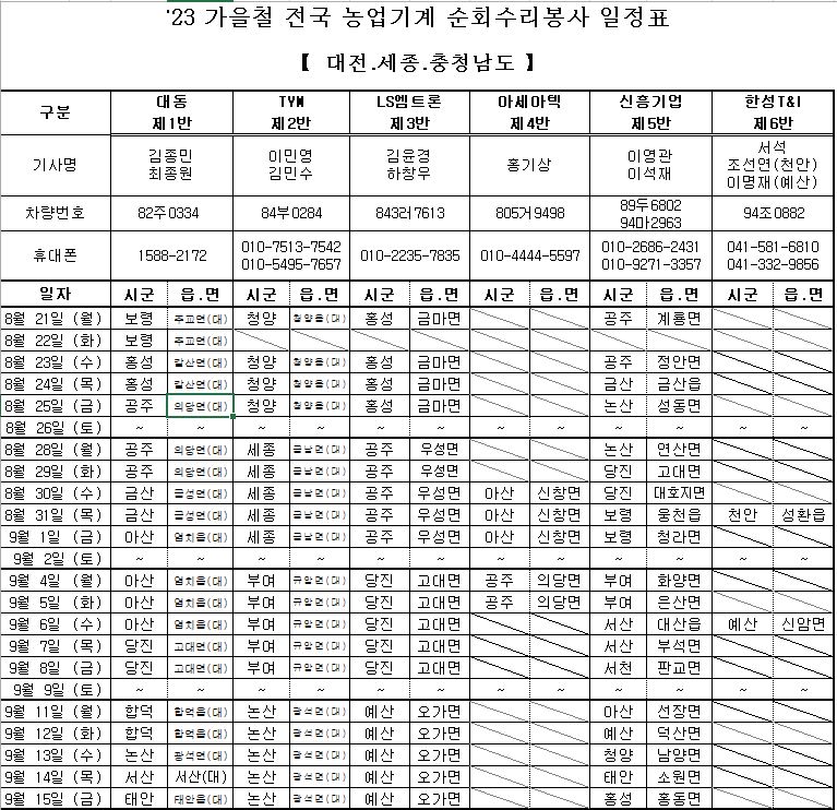 | 778 | 2023년 가을철 전국 농업기계 순회수리봉사 일정 알림 | 의당면 | 42 | 2023-08-28 | 가을철 농업기계 순회수리봉사 일정.JPG |
