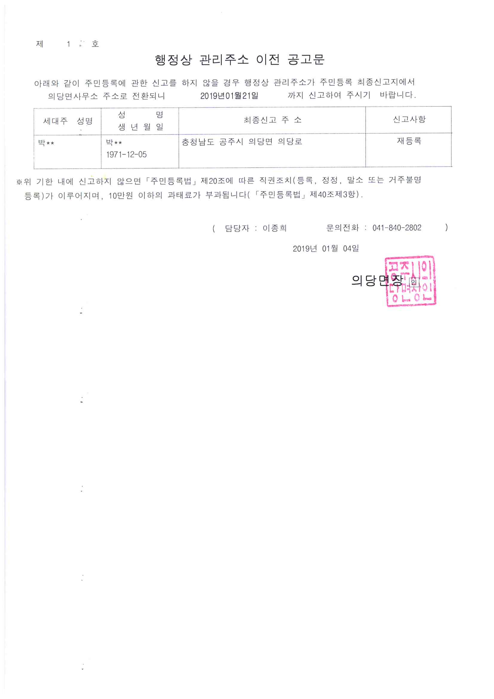 | 436 | 거부불명등록자 행정상 관리주소 이전 공고(1차) | 이종희 | 63 | 2019-01-04 | 행정상 관리주소 이전 공고문.jpg |