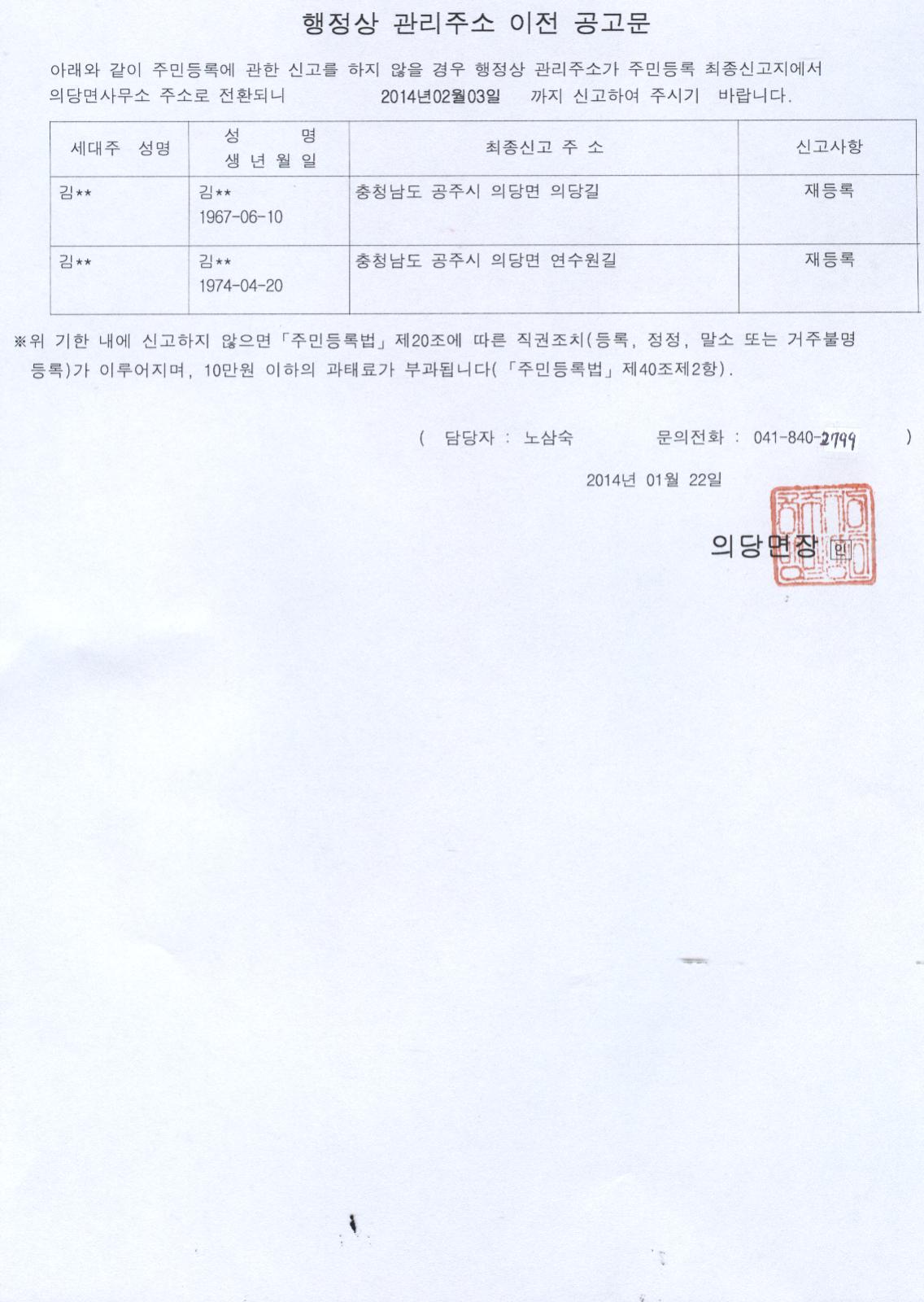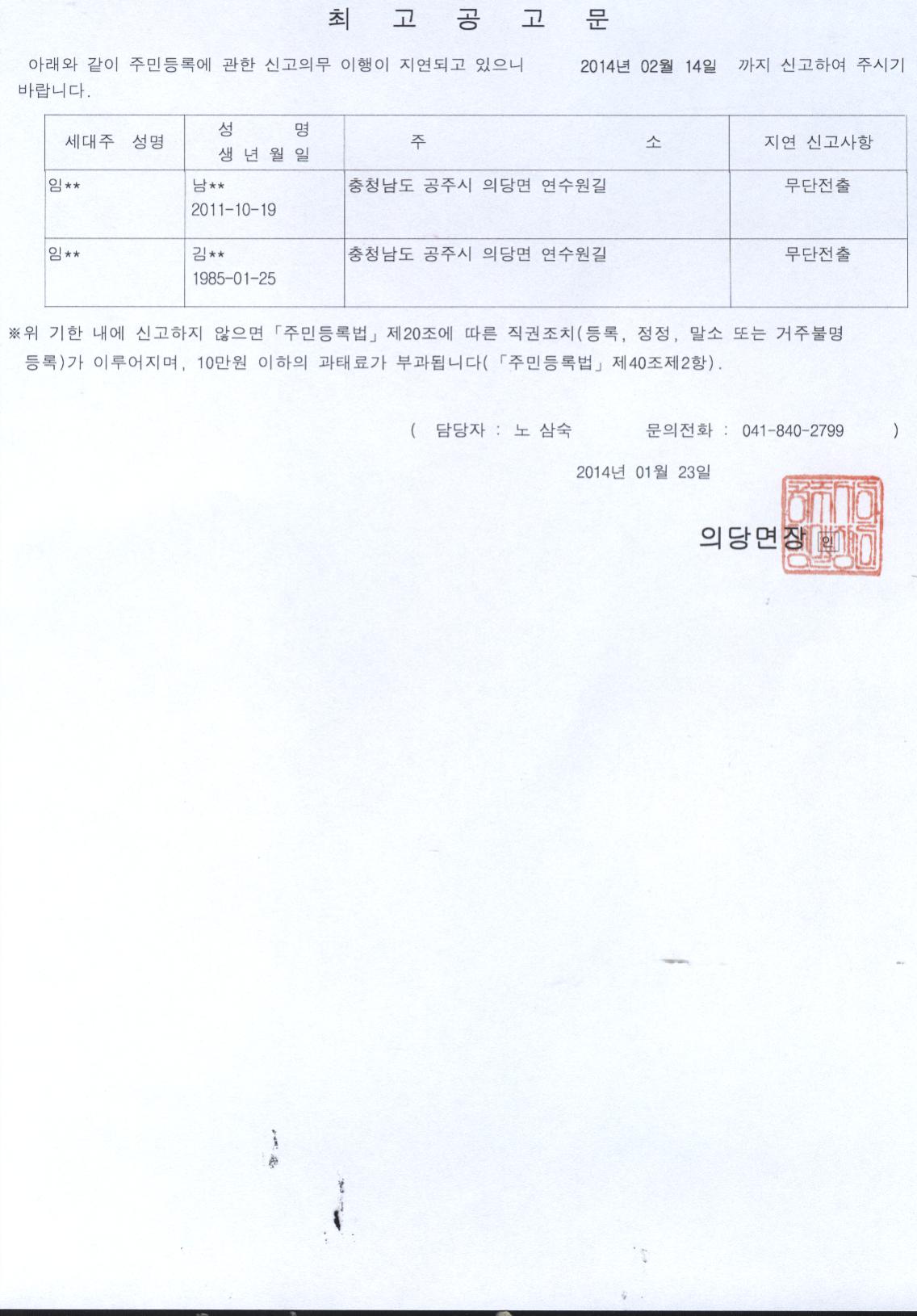 | 126 | 주민등록 무단전출자에 대한 최고공고문 | 의당면 | 1,276 | 2014-01-23 | 주민등록사항 불일치자 최고 공고.jpg |
