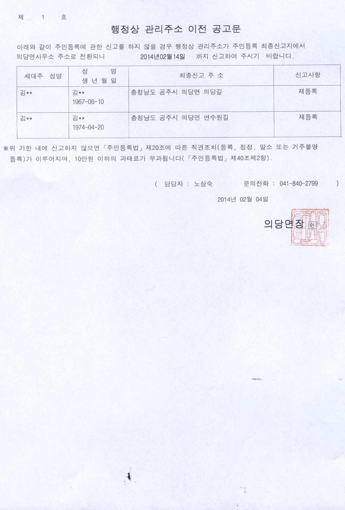 | 127 | 행정상 관리주소 이전 공고문 2차 | 의당면 | 1,270 | 2014-02-04 | 행정상 주소이전공고 2차.jpg |