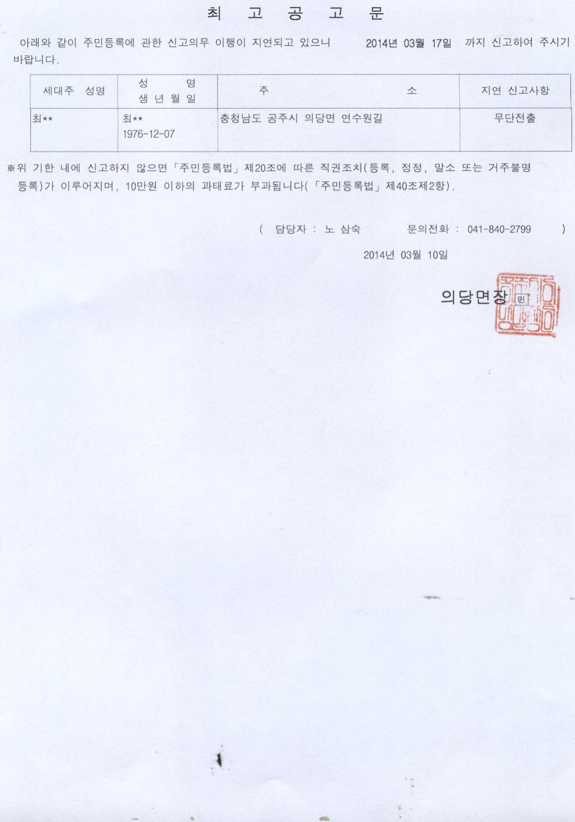 | 129 | 무단전출자에 대한 최고 공고문 | 의당면 | 1,259 | 2014-03-10 | 최고공고문.jpg |