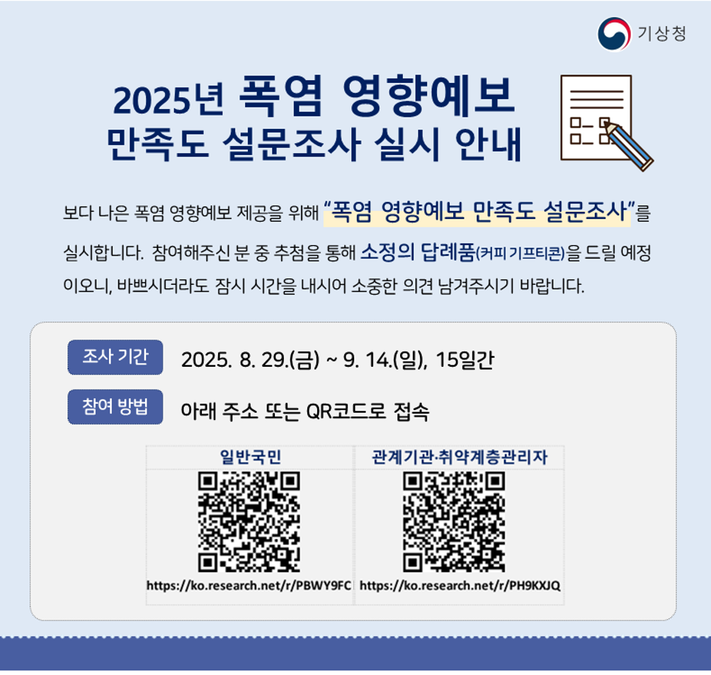 | 1758 | 2025년 폭염 영향예보 만족도 설문조사 실시에 따른 참여 안내 | 의당면 | 33 | 2025-09-02 | 사본 -2025년 폭염 영향예보 만족도 설문조사 안내.png |
