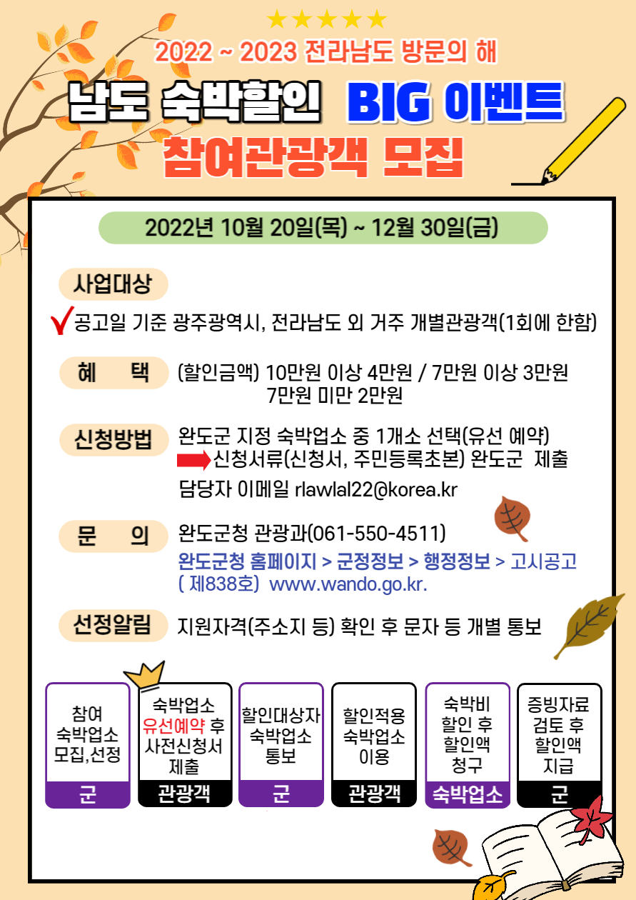 | 283 | 「2022~2023 전라남도 방문의 해」 남도 숙박할인 BIG 이벤트 참여관광객 모집 홍보 | 우성면 | 89 | 2022-10-20 | 남도 숙박할인 big 이벤트 참여 관광객 모집(홍보안).jpg |