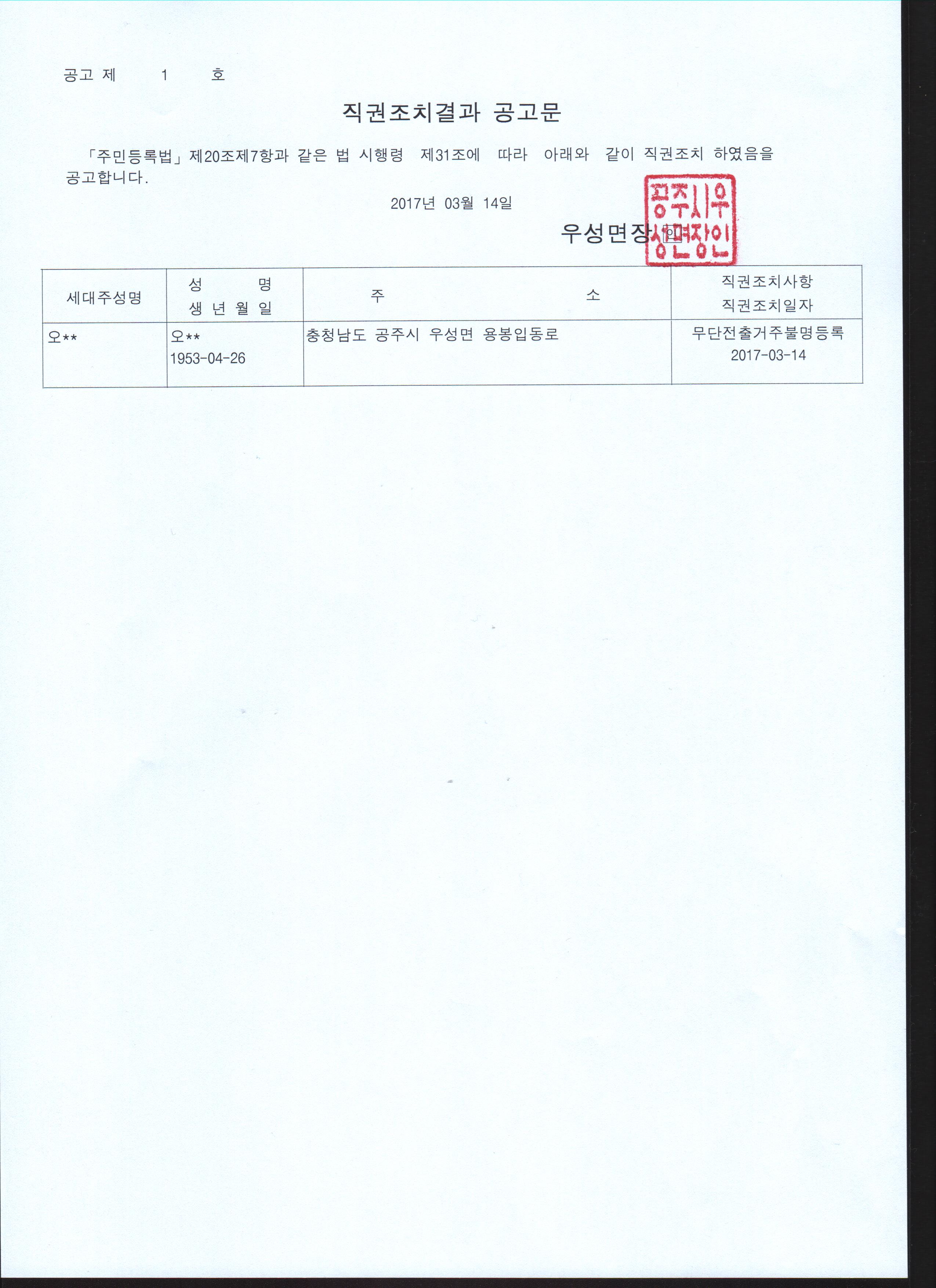 | 145 | 2017 주민등록 일제정리에 따른 무단전출자에 대한 직권조치결과 공고 | 우성면 | 849 | 2017-03-14 | 직권조치결과 공고문.jpg |