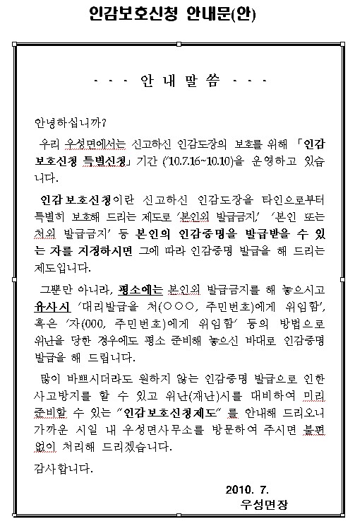 | 15 | 인감보호 신청 안내문 | 관리자 | 901 | 2010-07-20 | 안내문.JPG |