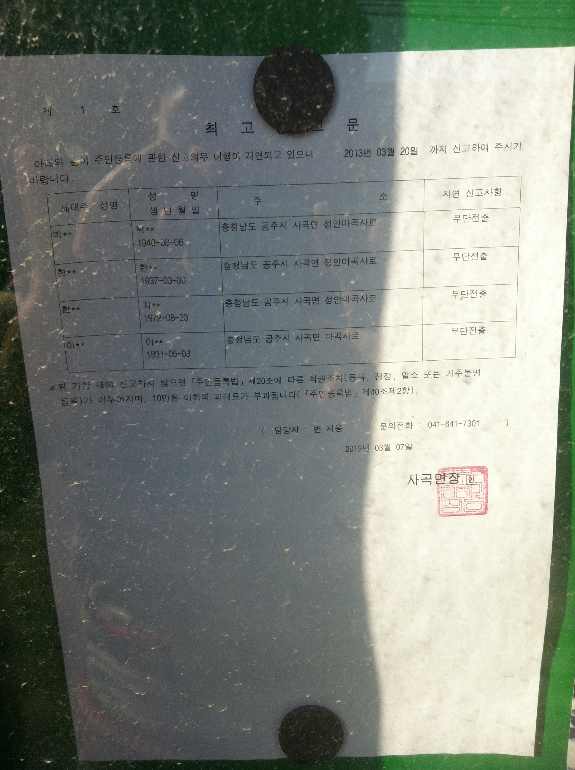 | 172 | 주민등록 특별사실조사에 따른 주민등록 신고 불이행자에 대한 공고 | 사곡면 | 1,283 | 2013-03-11 | 공고문.jpg |