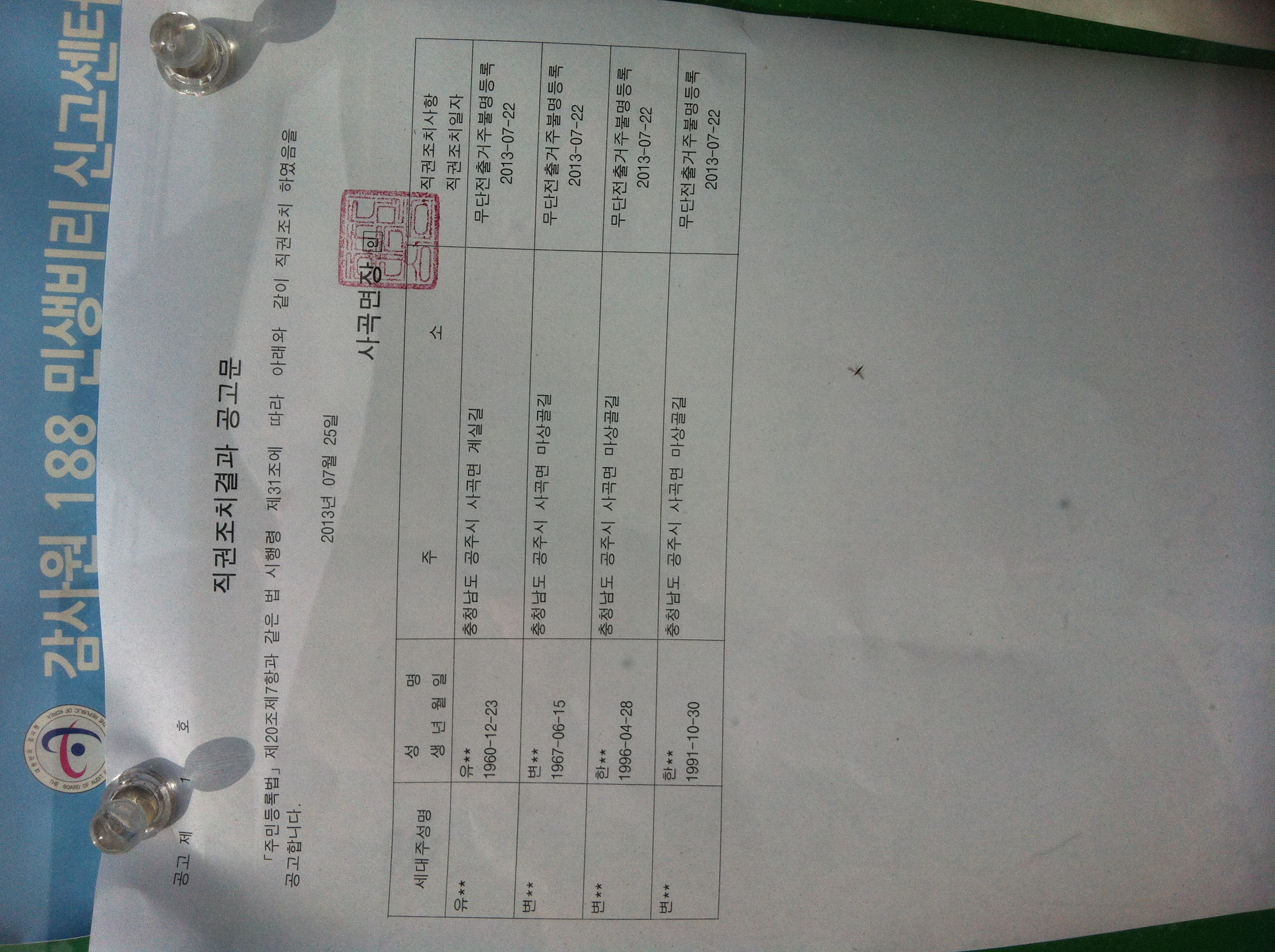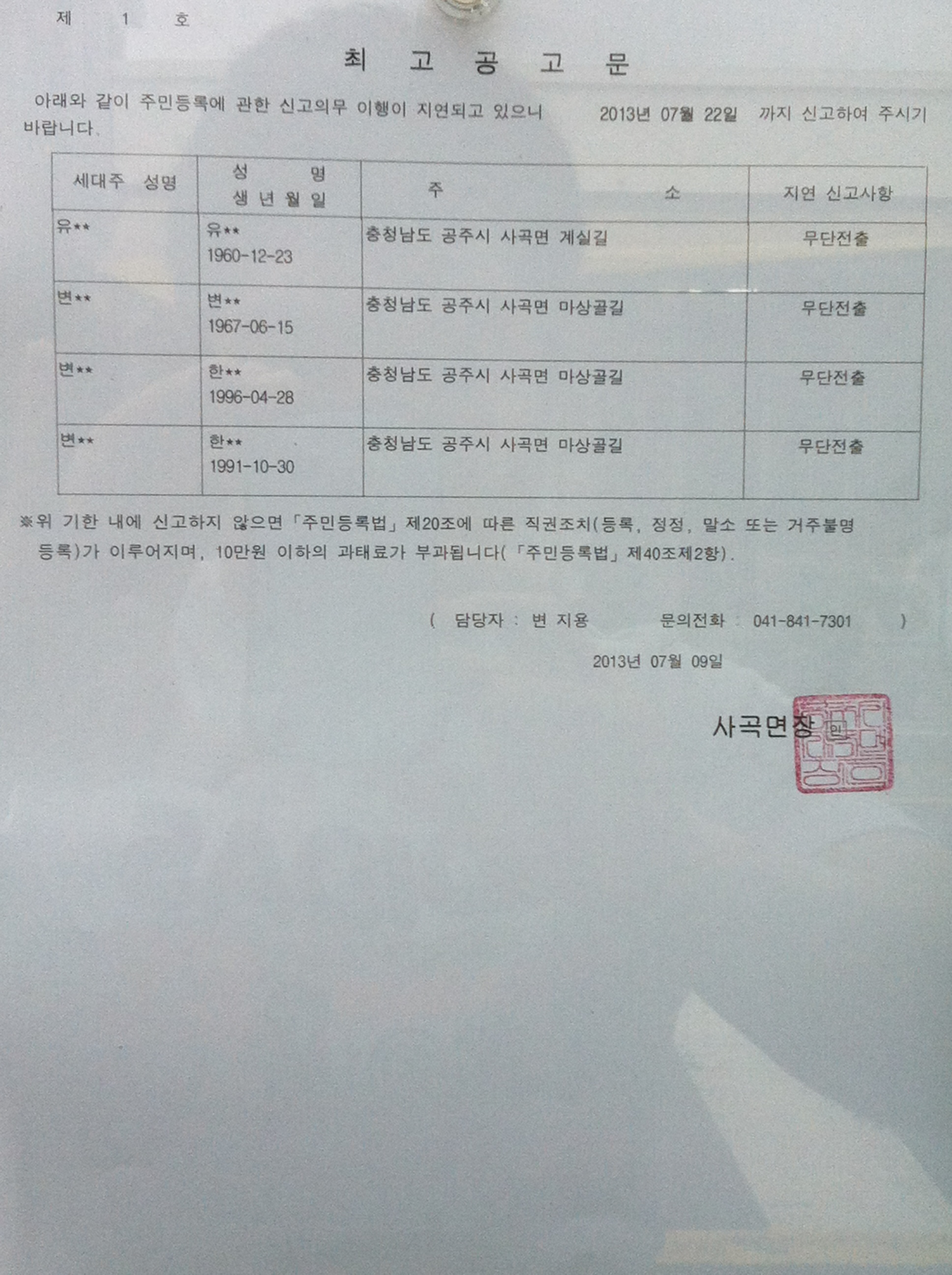| 176 | 주민등록 특별 사실조사에 따른 주민등록 신고 불이행자에 대한 공고 | 사곡면 | 1,666 | 2013-07-09 | 최공공고문.jpg |