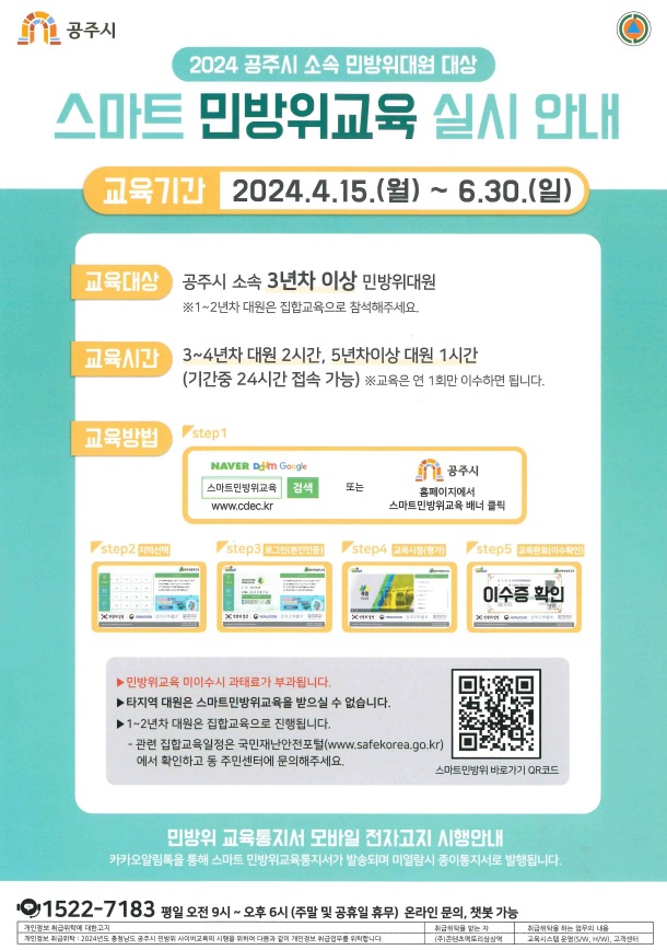 | 1172 | 2024년 공주시 소속 민방위대원 대상 스마트 민방위교육 실시 안내 | 신풍면 | 117 | 2024-04-30 | 스마트민방위교육홍보물.jpg |