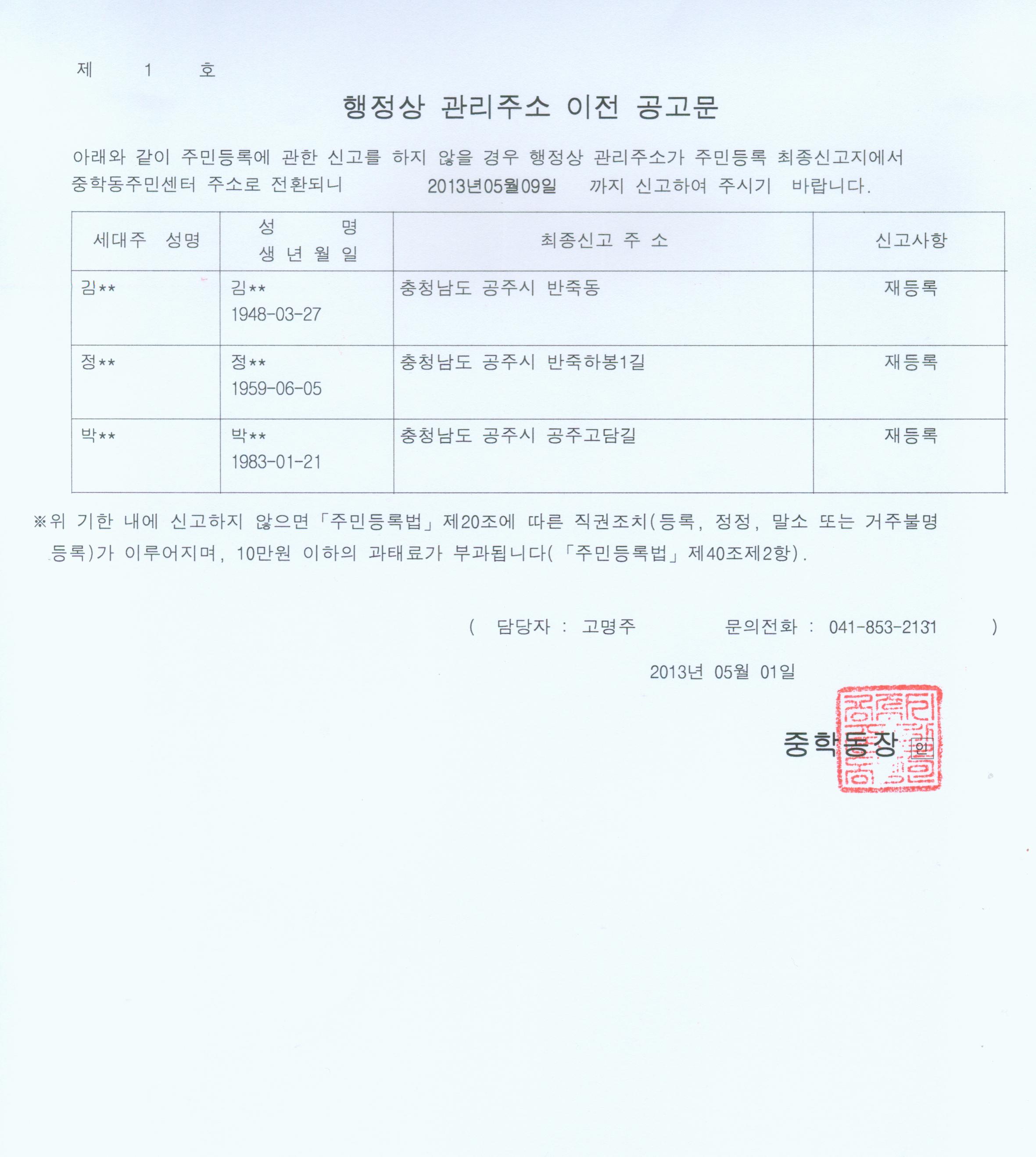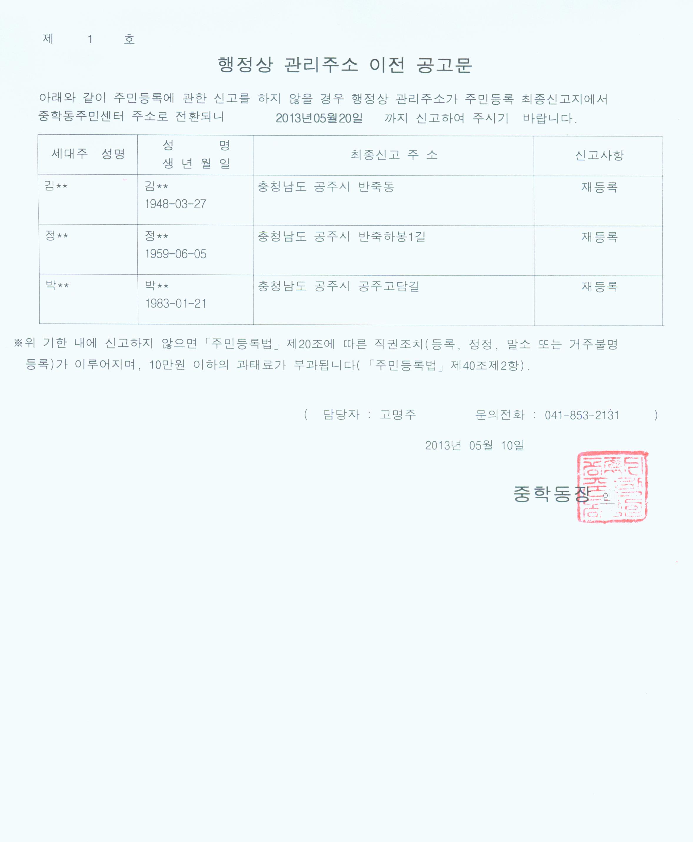 | 37 | 행정상 관리주소 이전 2차 공고 | 중학동 | 1,230 | 2013-05-10 | 행정상주소이전공고문2차.jpg |