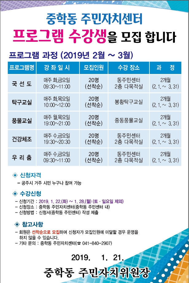 | 245 | 2019년 중학동 주민자치센터 프로그램 수강생 모집 | 중학동 | 277 | 2019-01-17 | 2019주민자치센터 수강생 모집.jpg |