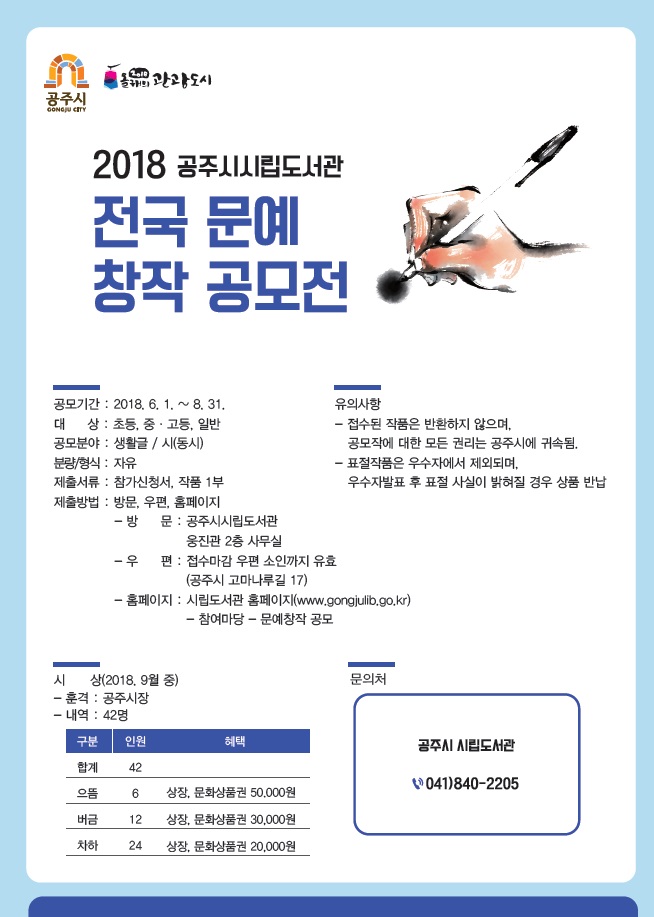 | 213 | 2018 전국 문예창작 공모전 개최 안내 | 중학동 | 168 | 2018-05-29 | 홍보문.jpg |