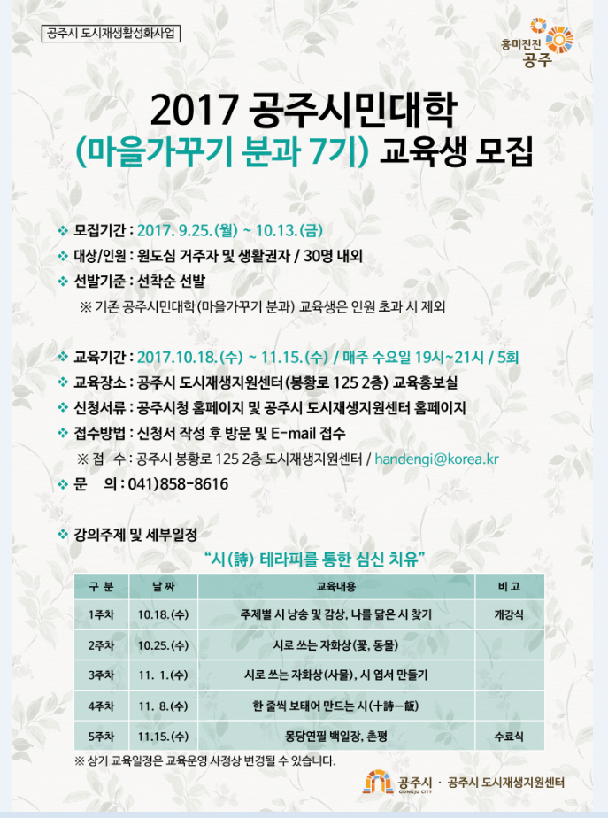 | 177 | 2017공주시민대학 마을가꾸기분과7기 교육생 모집 | 중학동 | 214 | 2017-09-29 | 시민대학(마을가꾸기 분과) 교육생 모집.PNG |