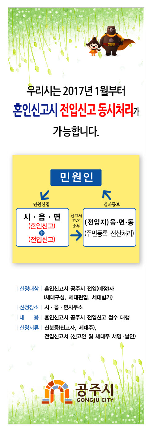 | 172 | 2017년 1월부터 공주시에서는 혼인신고시 전입신고가 가능합니다. | 중학동 | 784 | 2017-06-01 | 홍보문.jpg |
