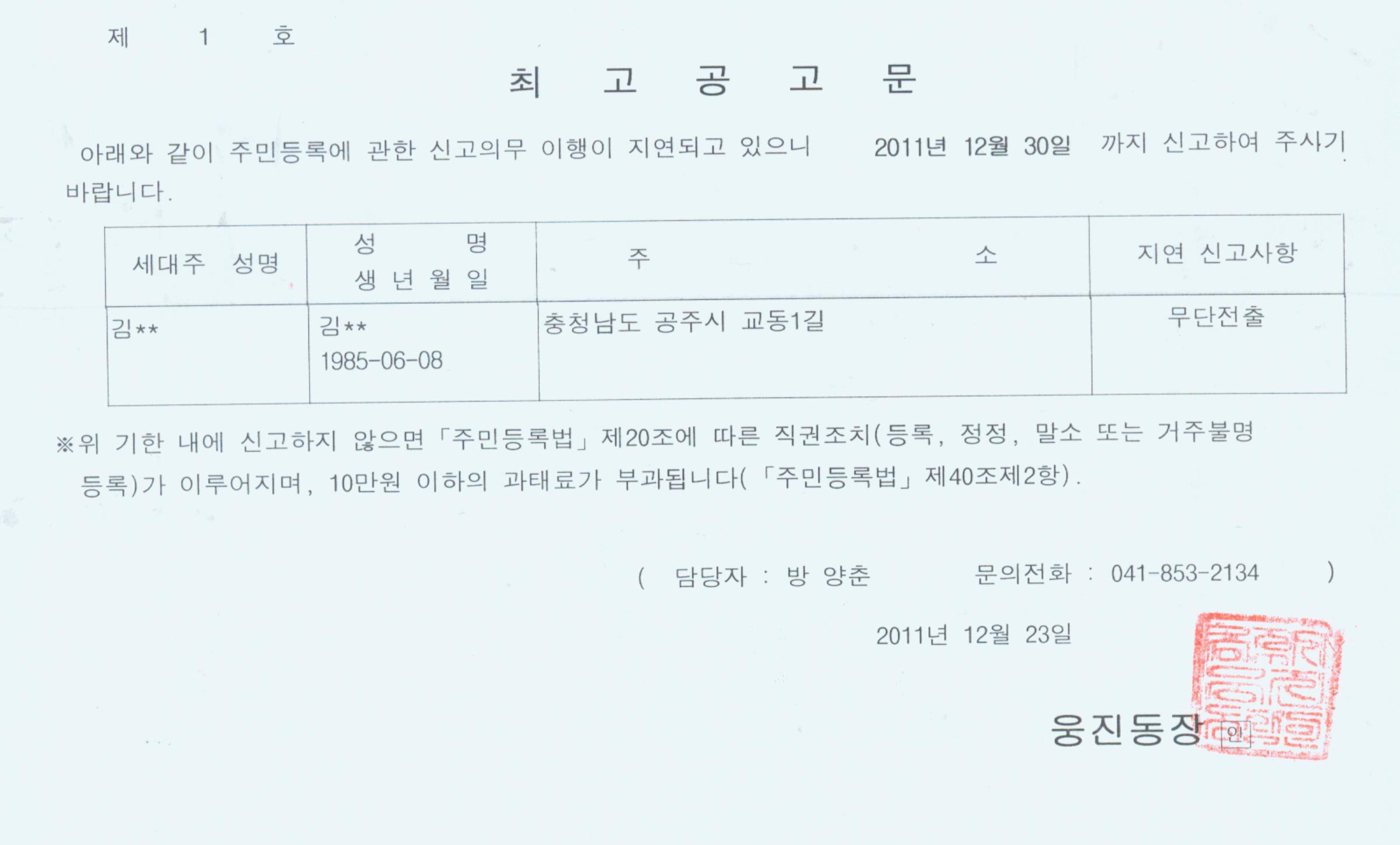 | 254 | 주민등록 최고 공고 | 관리자 | 725 | 2011-12-23 | 주민등록 공고문.jpg |